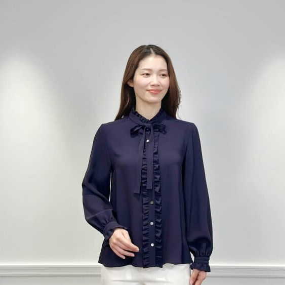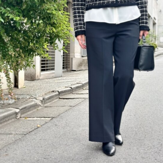 ロングシーズンで活躍するネイビーパンツスーツは、清楚で知的な女性像へと導きます。