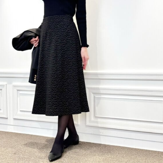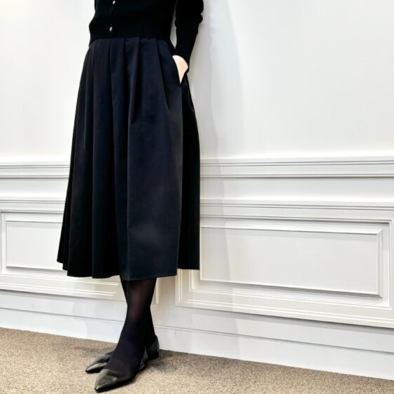 ウォッシャブル対応ながらエレガントなふんわりシルエットが魅力的なスカートは、全体のバランスを考えた華奢見えアイテム!