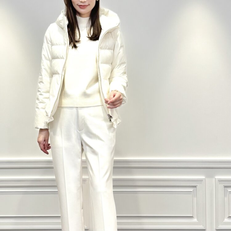 ボディラインを綺麗に見せる、美シルエットが素晴らしく、小さめの襟やパールボタン使いが大人可愛いを演出します。