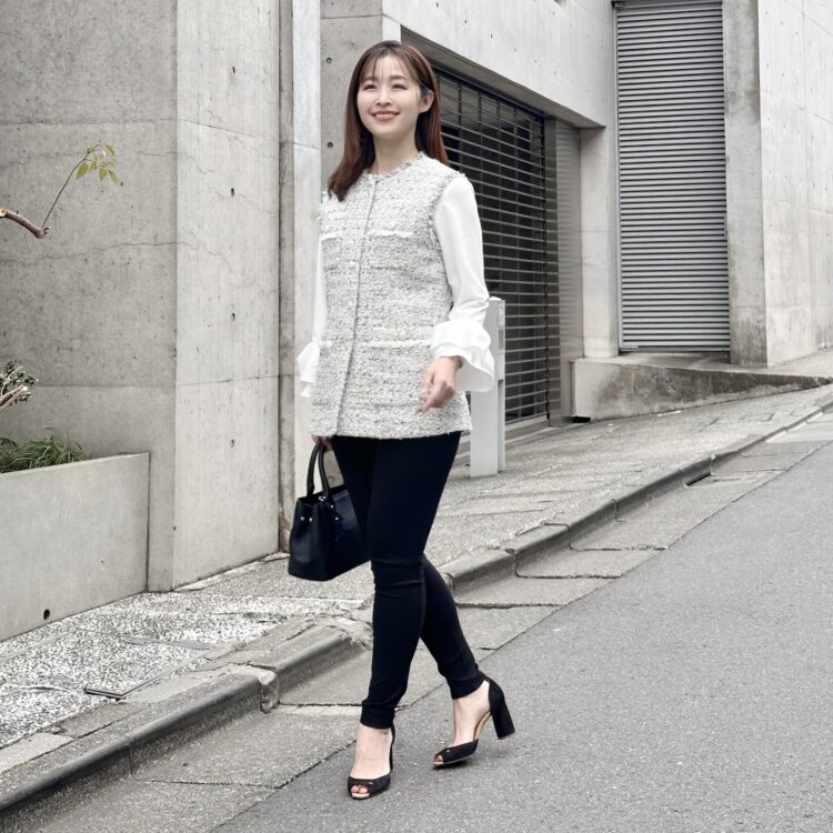 ボディラインを綺麗に見せる、美シルエットが素晴らしく、小さめの襟やパールボタン使いが大人可愛いを演出します。