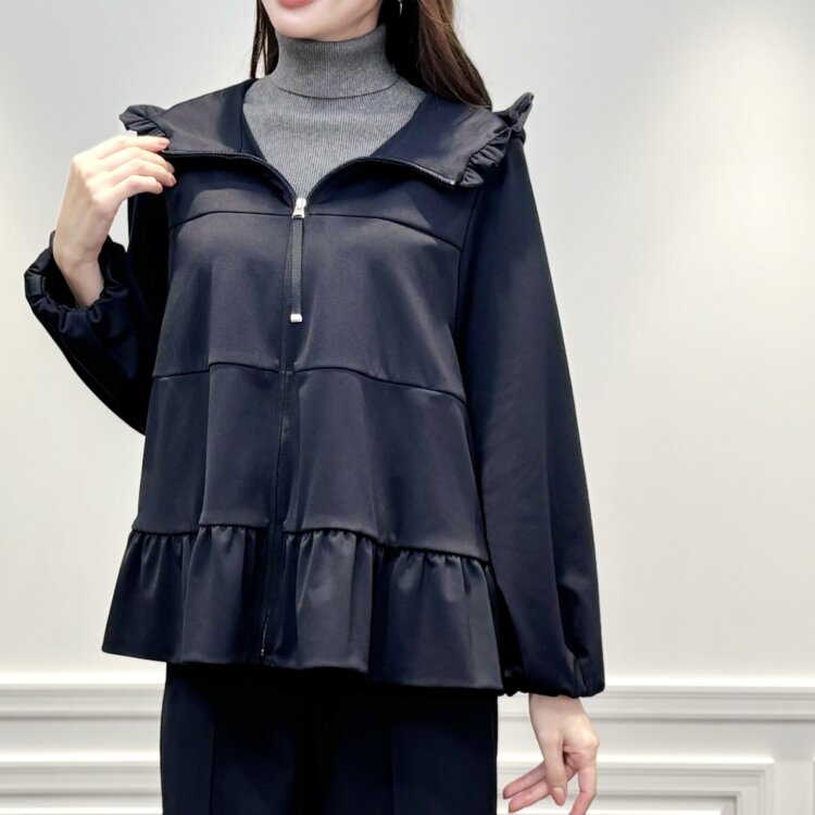 裾に向かって広がるゆったりとしたシルエットが気になる腰まわりをカバーしてくれ、細身のテーパードパンツとバランス良くお召しいただけ上品な印象に。