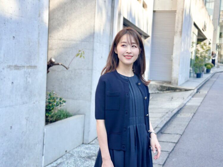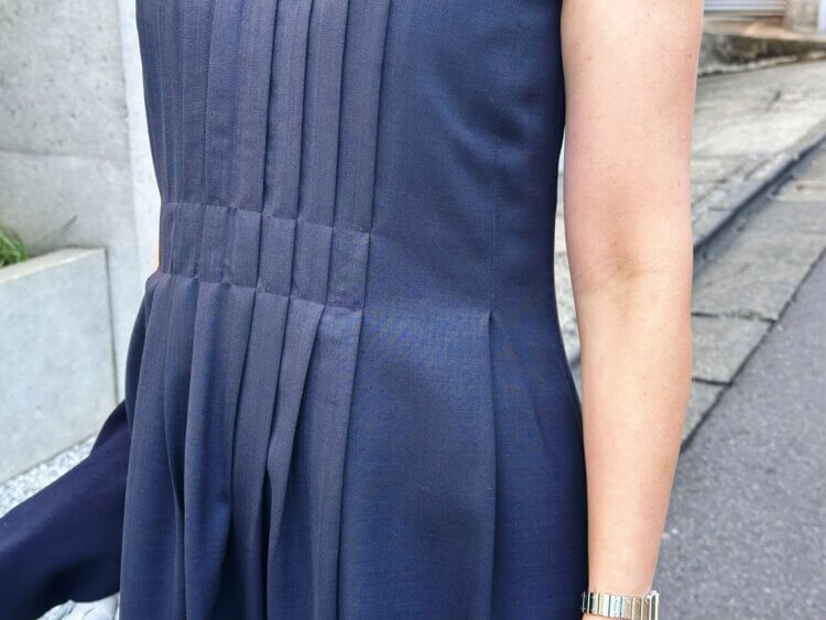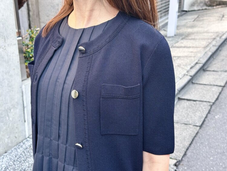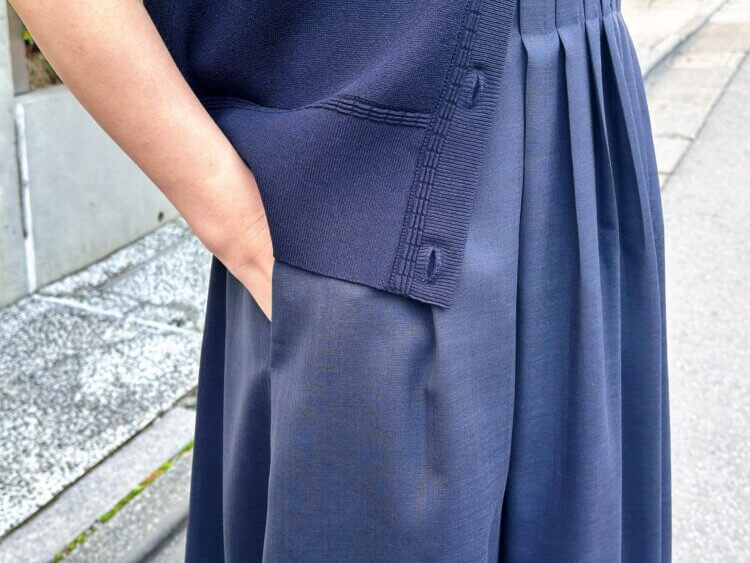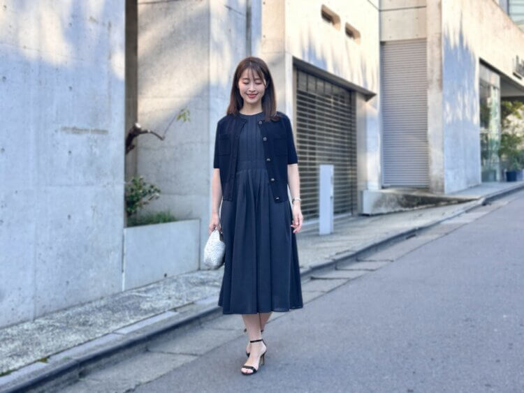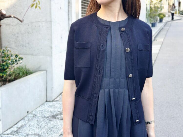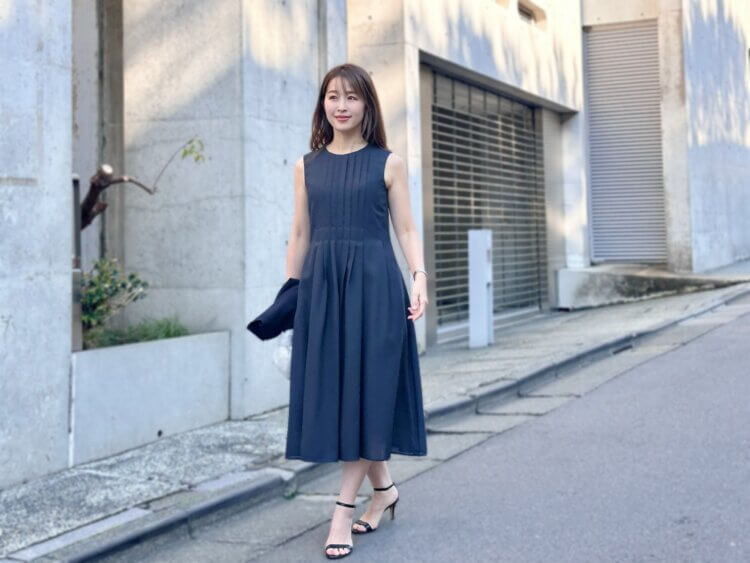 先日着用していたのは、プリーツデザインノースリーブワンピースにニットカーディガンを合わせたネイビーコーディネート。落ち着いたカラーでまとめることで、シンプルながらも洗練された印象に仕上がります。