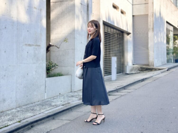 通勤やお仕事シーンはもちろん、学校行事やお食事など、少しきちんとしたい日にも活躍するネイビーコーディネート。シンプルながらも女性らしさを引き立ててくれる、大人におすすめのサマースタイルです。