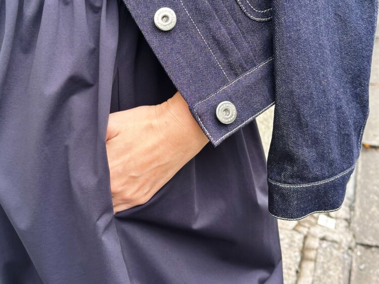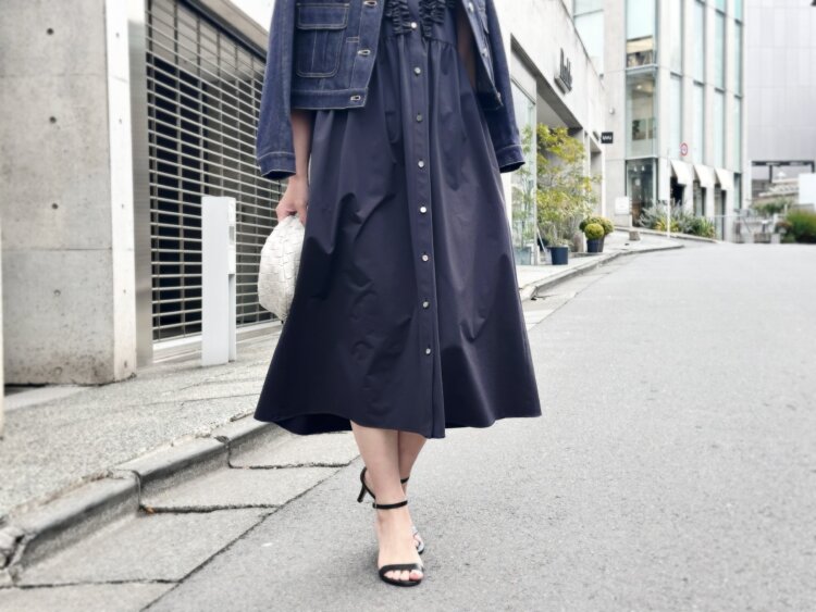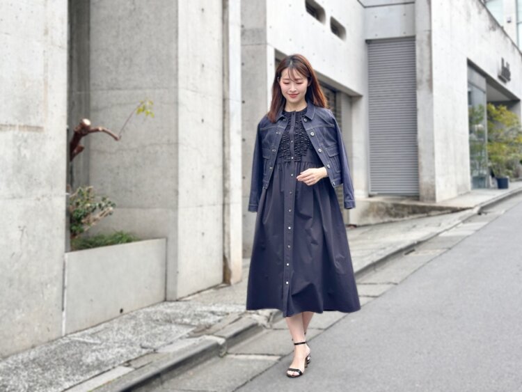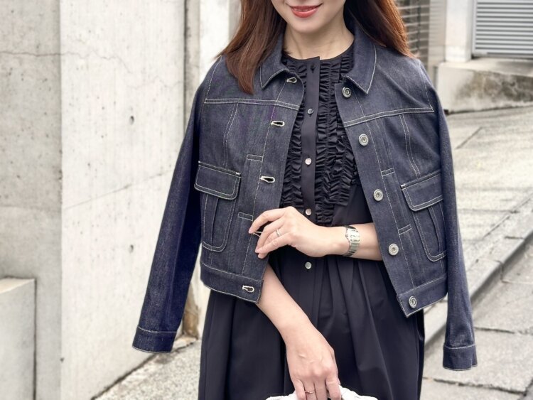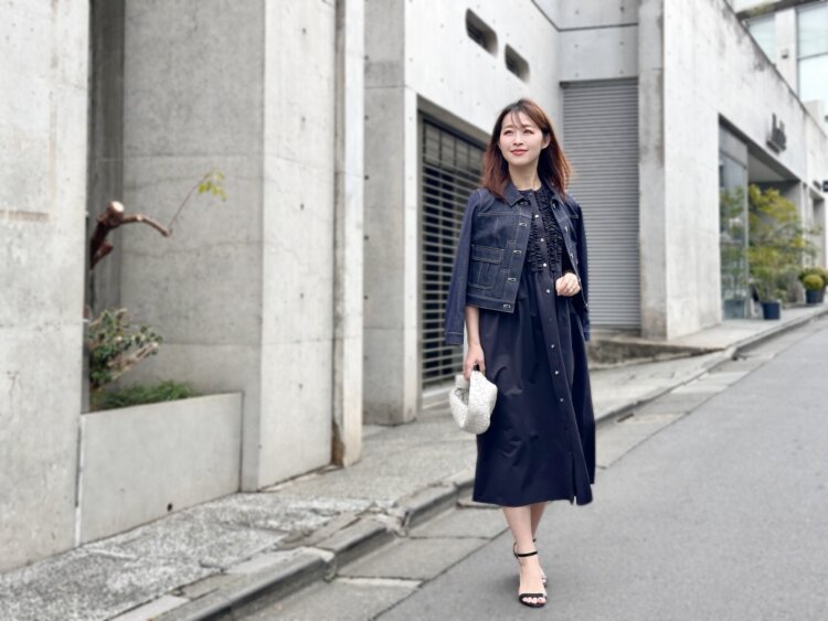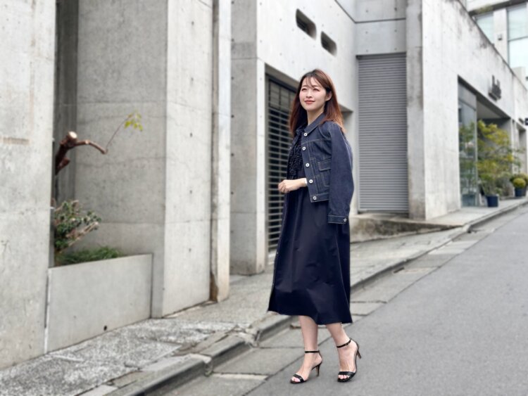 今回は、そんなワンピースにワンウォッシュデニムジャケットを合わせて、少しカジュアルダウンしたスタイリングに。コンパクトなシルエットのデニムジャケットを羽織ることで、全体が引き締まり、ぐっとこなれた印象に仕上がります。