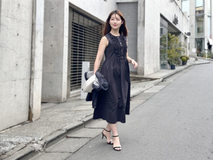 フロントにあしらわれた繊細なフリルが目を惹くワンピースは、着るだけで自然と華やかな印象に。縦に並んだ前開きデザインのおかげで、甘さがありながらもすっきりとしたラインをキープしてくれるのが嬉しいポイントです。実際に着てみると、ストレッチ性のある素材でとても動きやすく、子どもとのお出かけや送り迎えのシーンでもストレスなく過ごせる着心地の良さを実感しました。
