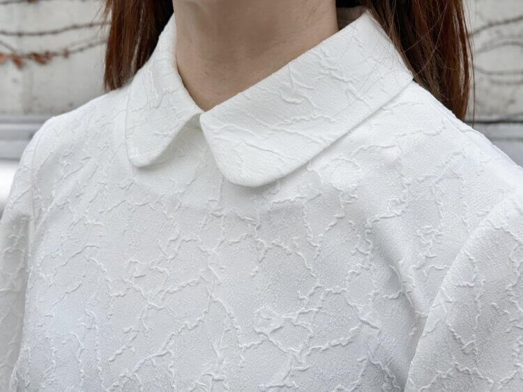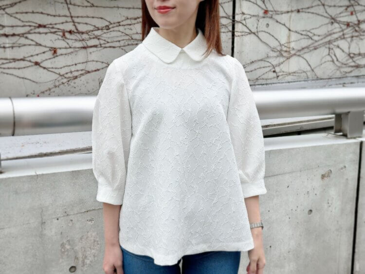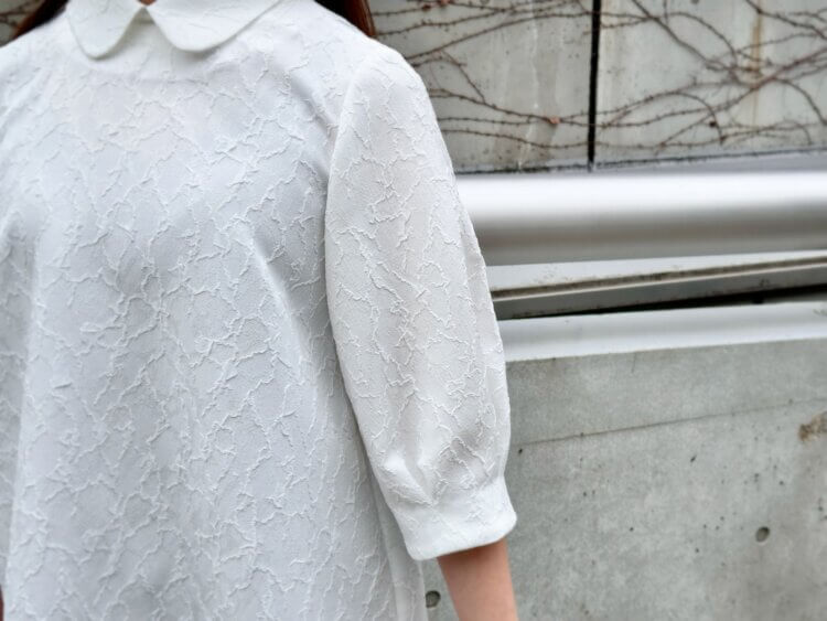 シンプルな形ですが、立体感のあるジャガード素材がさりげなく華やかで、一枚で着ても自然ときれい見えするのが嬉しいポイントです。丸みのある襟元が柔らかい印象を作ってくれるので、きちんと感がありながらもどこか優しい雰囲気に。袖のふんわりとしたボリュームも程よく、気になる腕まわりをカバーしてくれるのも個人的に嬉しいところです。