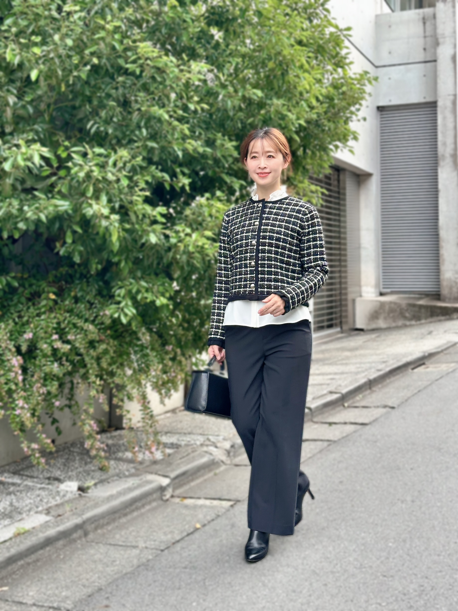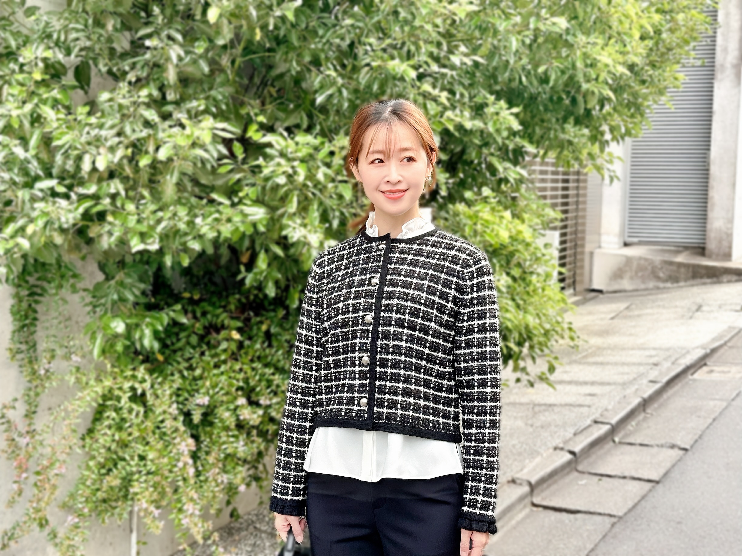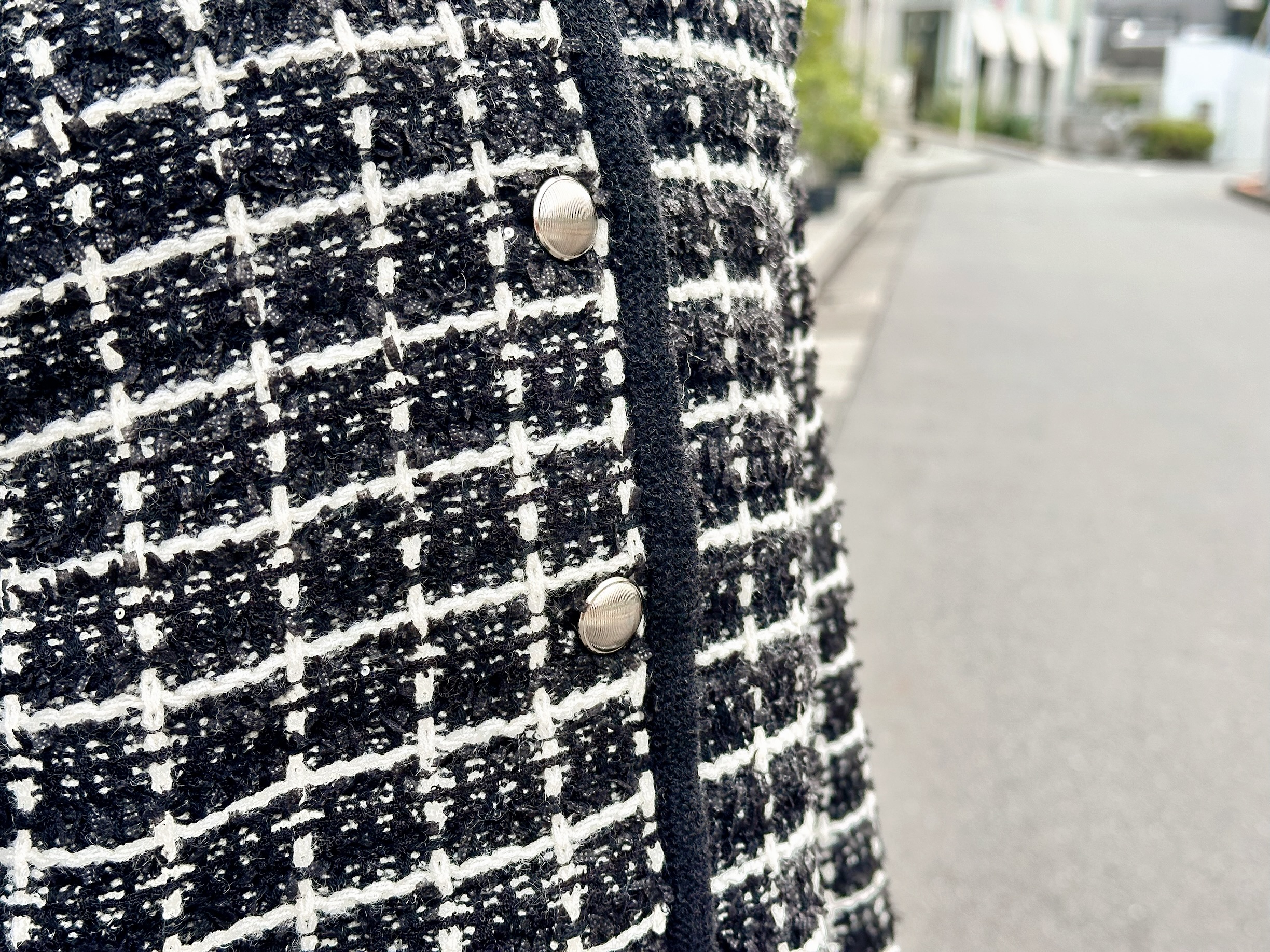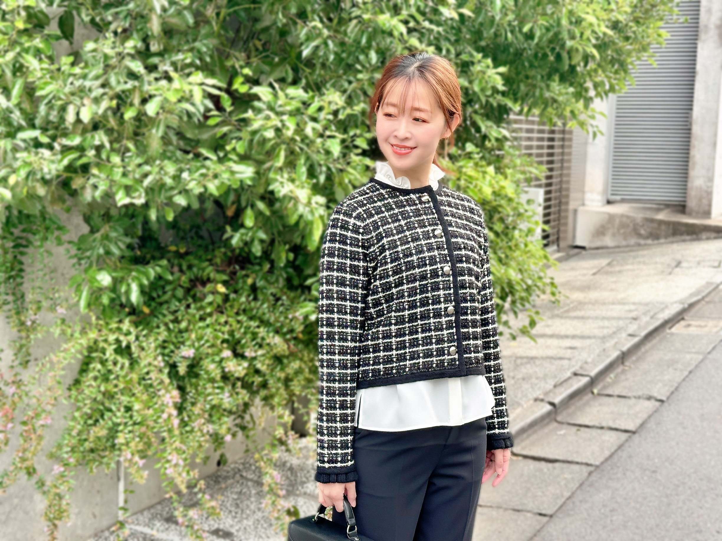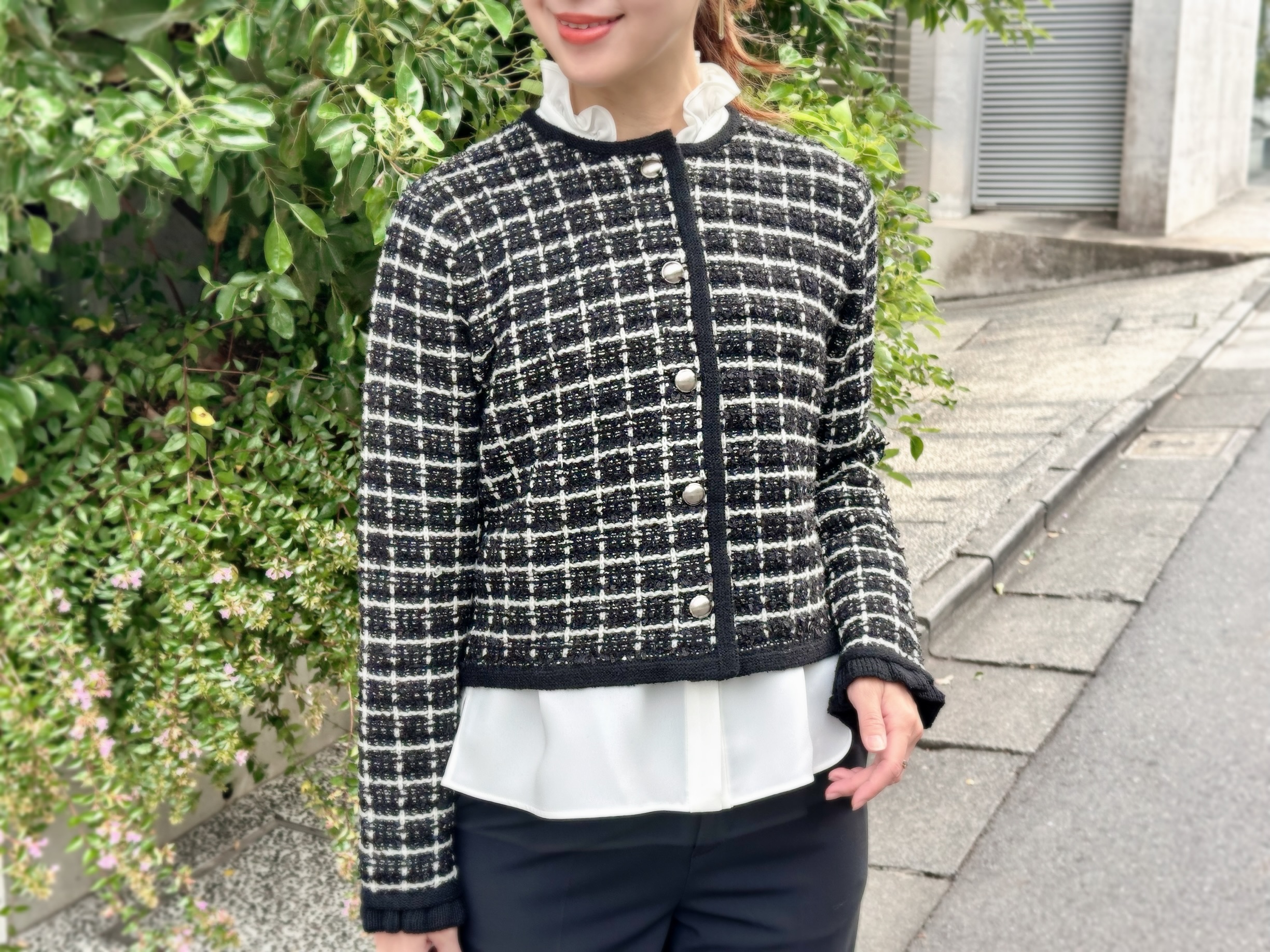 セレモニーらしい華やかさが欲しくて、【ツイードニットジャケット】を主役に。