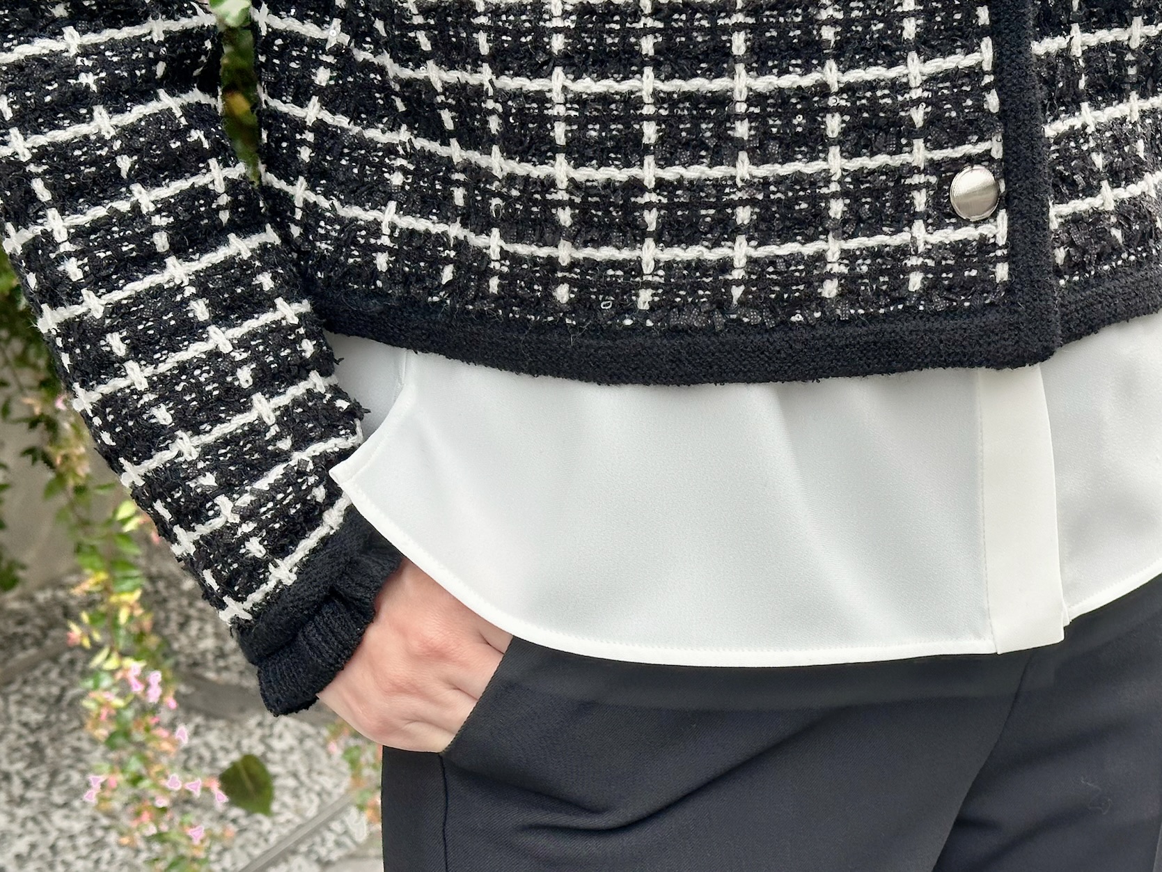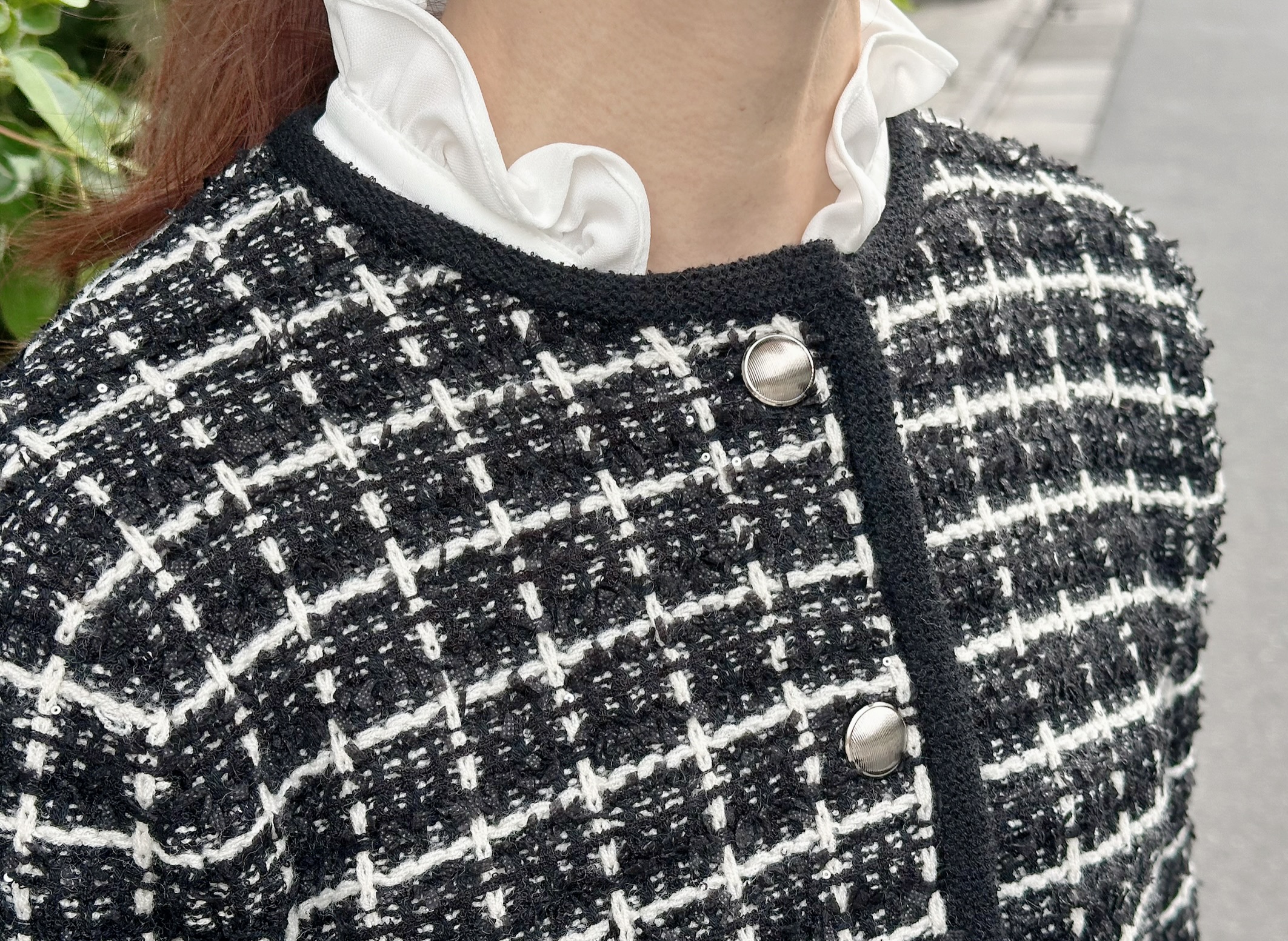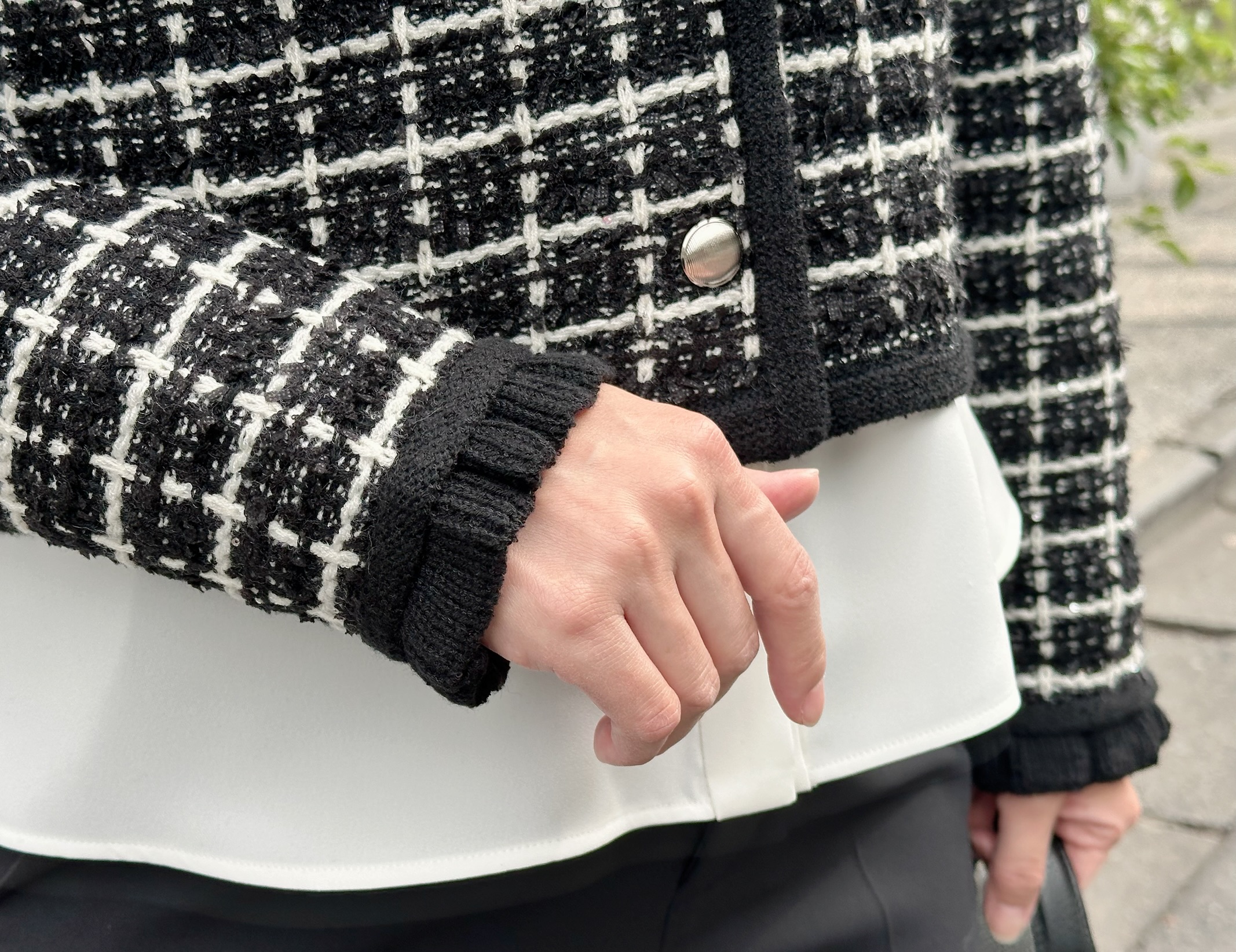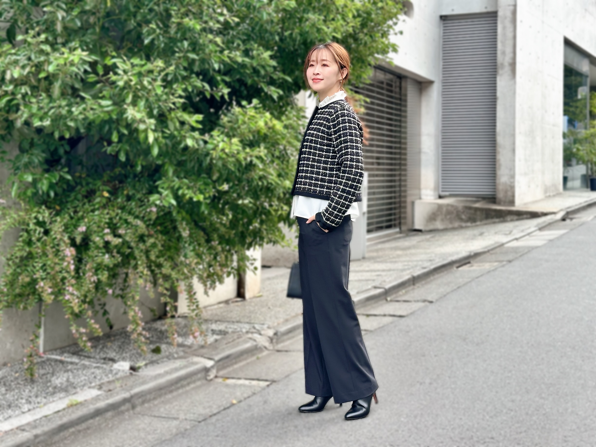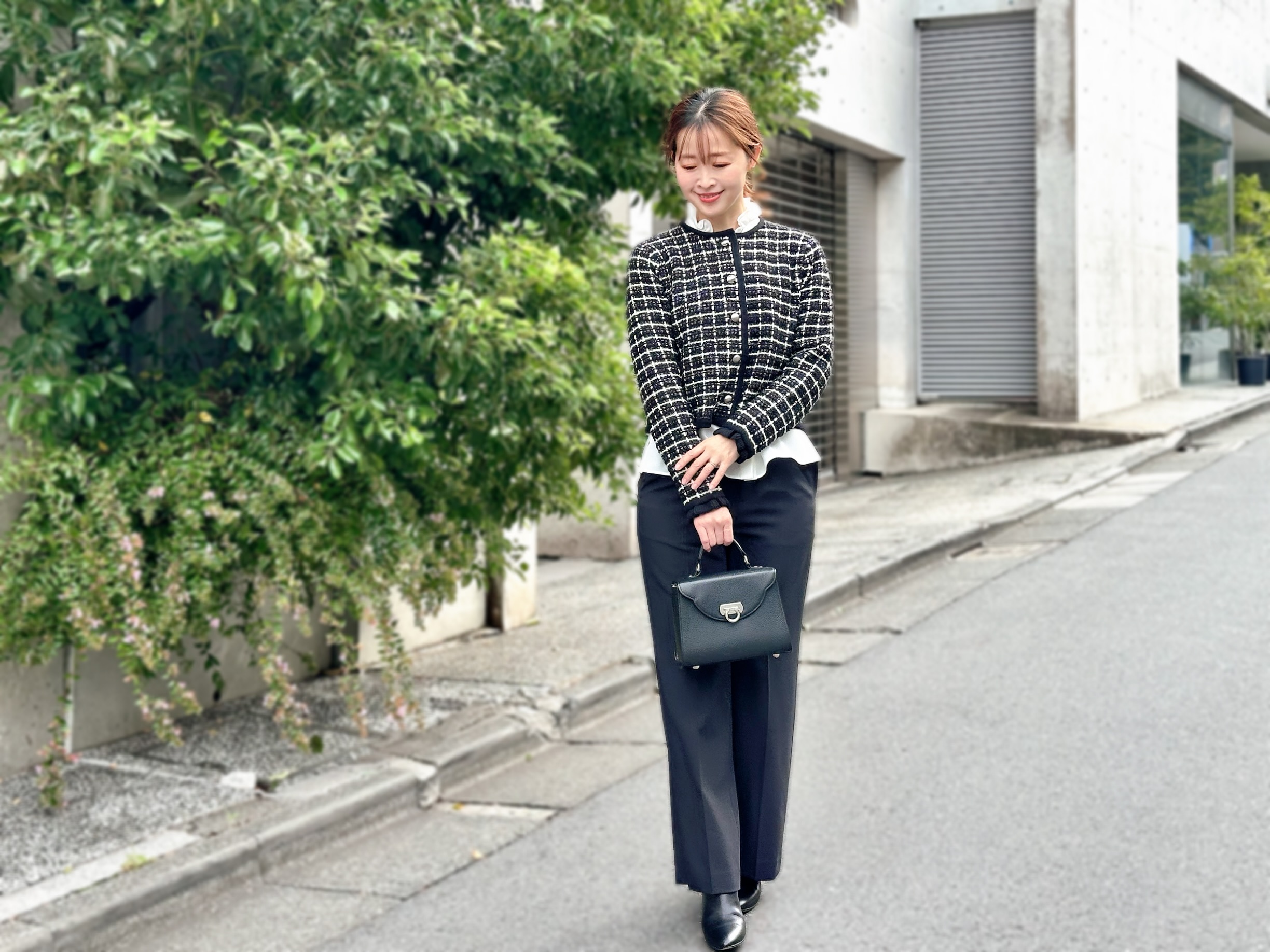 セレモニーらしい華やかさが欲しくて、【ツイードニットジャケット】を主役に。