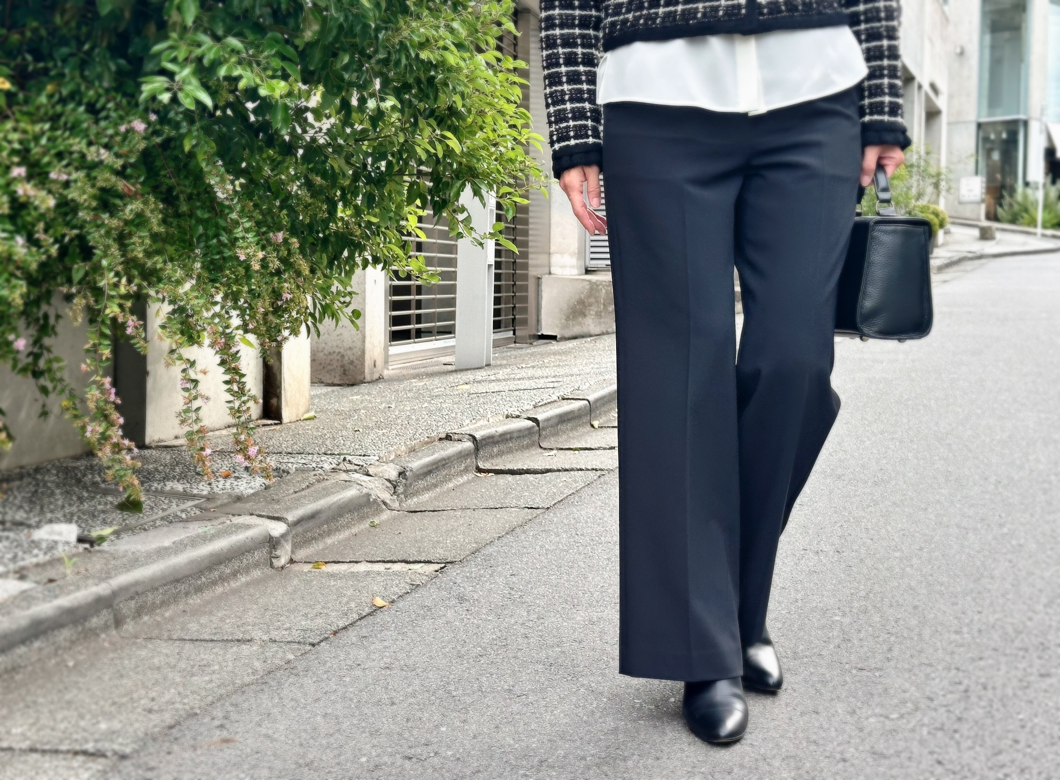 ボトムスはスカートも素敵ですが、お子さまとのお参りや移動を考えて【ストレッチストレートワイドパンツ】をチョイス。ハリのある素材でシルエットがきれいに出て、写真でも立ち姿がすっきり。長時間履いてもシワになりにくく、行事のあとのランチにも気兼ねなく行けます。