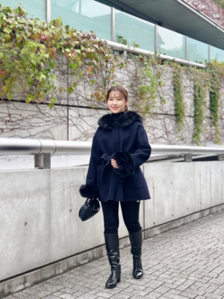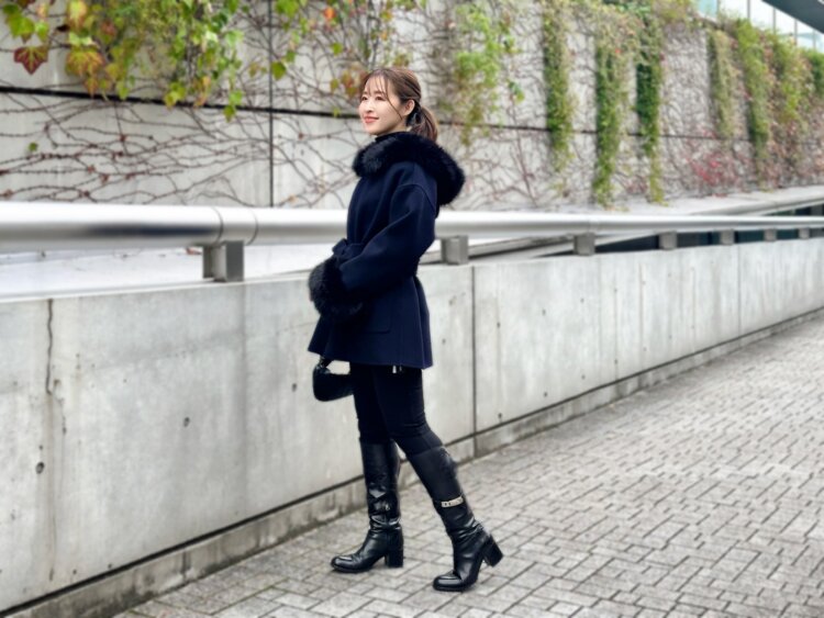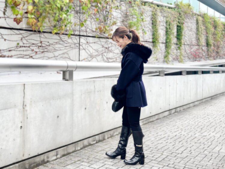 ブーツもバッグもブラックでまとめ、ネイビーコートの美しさを引き立たせたシンプルなワンカラーコーデ。ママのOFFの日にちょうどいい、“頑張りすぎない華やかさ”を意識しました。