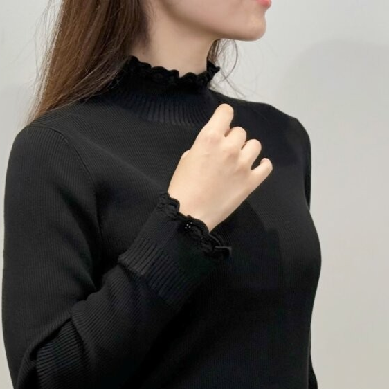 裾と袖口のフリルデザインが華やかなニットプルオーバーは、コンパクトな着丈でトップスアウトでのコーディネートに相性抜群です!薄手ですがウール100%の肌触りの良い暖かな素材なので、寒さ本番の1、2月に重宝します。