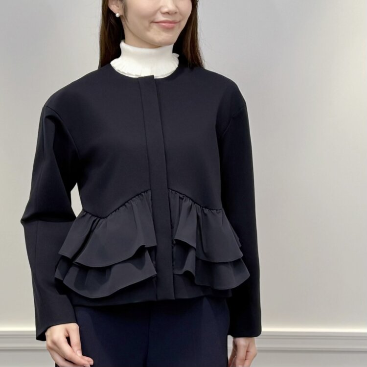 襟ぐりのフリルデザインがコートやジャケットを合わせた時にお顔周りに華やぎを与えてくれます。リブニットで程よくフィット感があるので綺麗めな印象でお召しいただけ、スカートとのセットのコーディネートが人気を集めました。