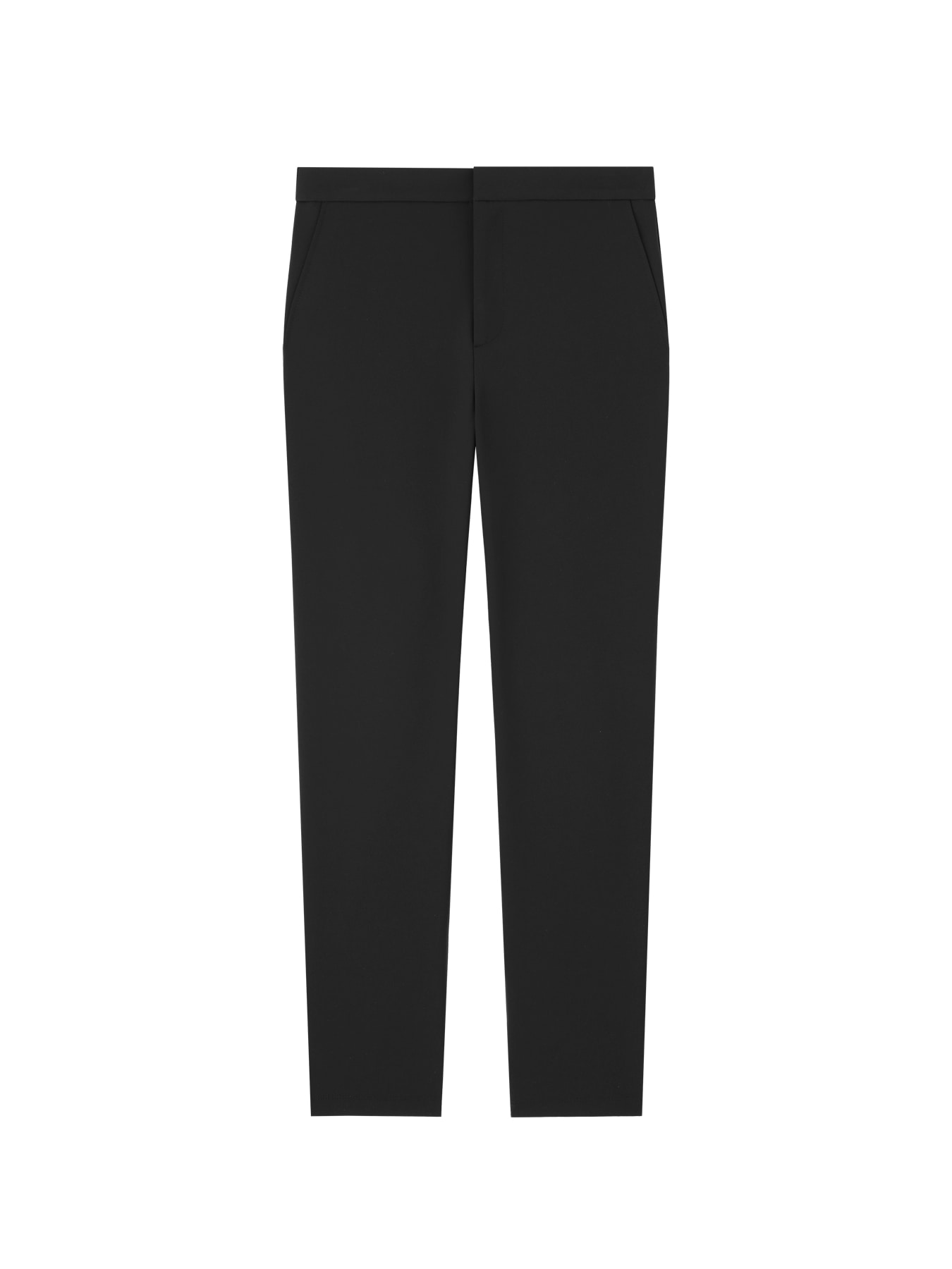 美しい艶感が高級な雰囲気を醸し出すストレッチ素材のパンツ。
