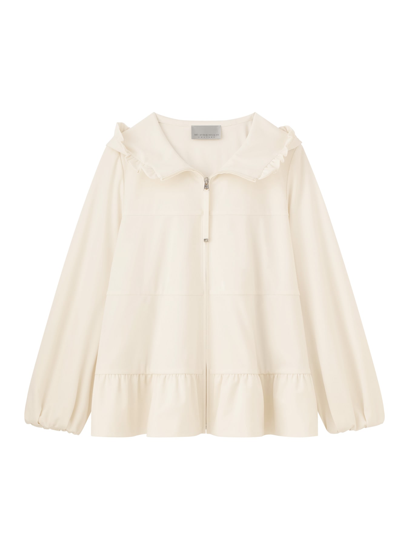 フードと裾にあしらわれたフリルがエレガントな印象を添える、ジップアップパーカー。