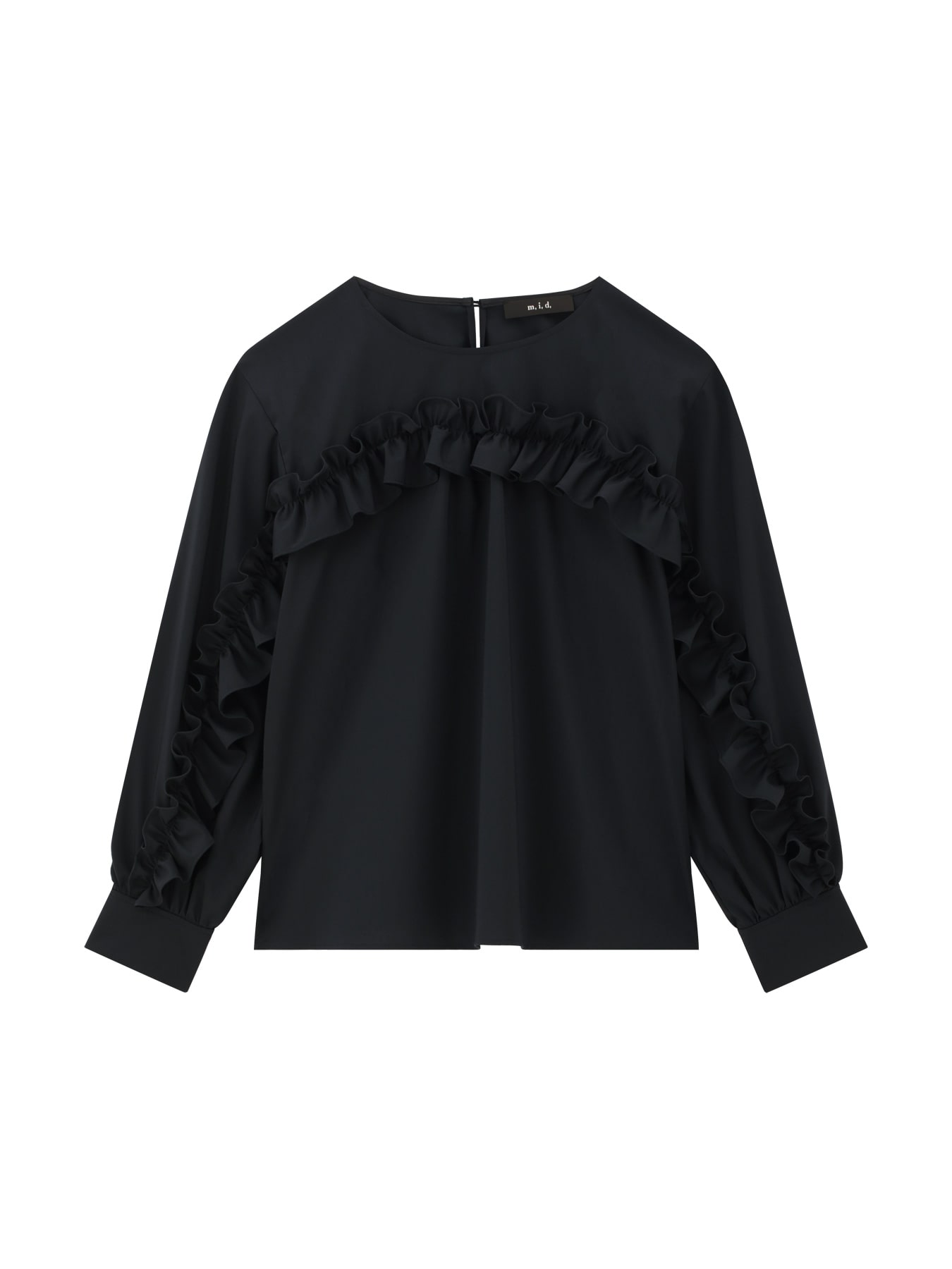 身頃から袖にかけて流れるように施されたフリルが、女性らしく華やかな印象を与えるブラウス。