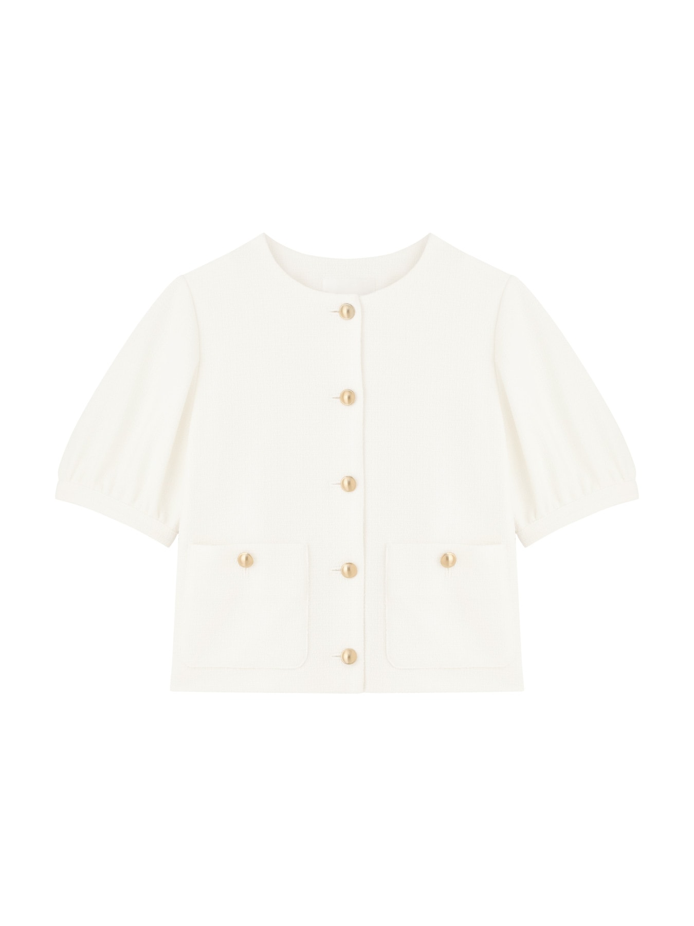 フロントにあしらわれたゴールドボタンが洗練されたアクセントとなり、コンパクトなシルエットに女性らしい華やかさを添えてくれる一枚です。