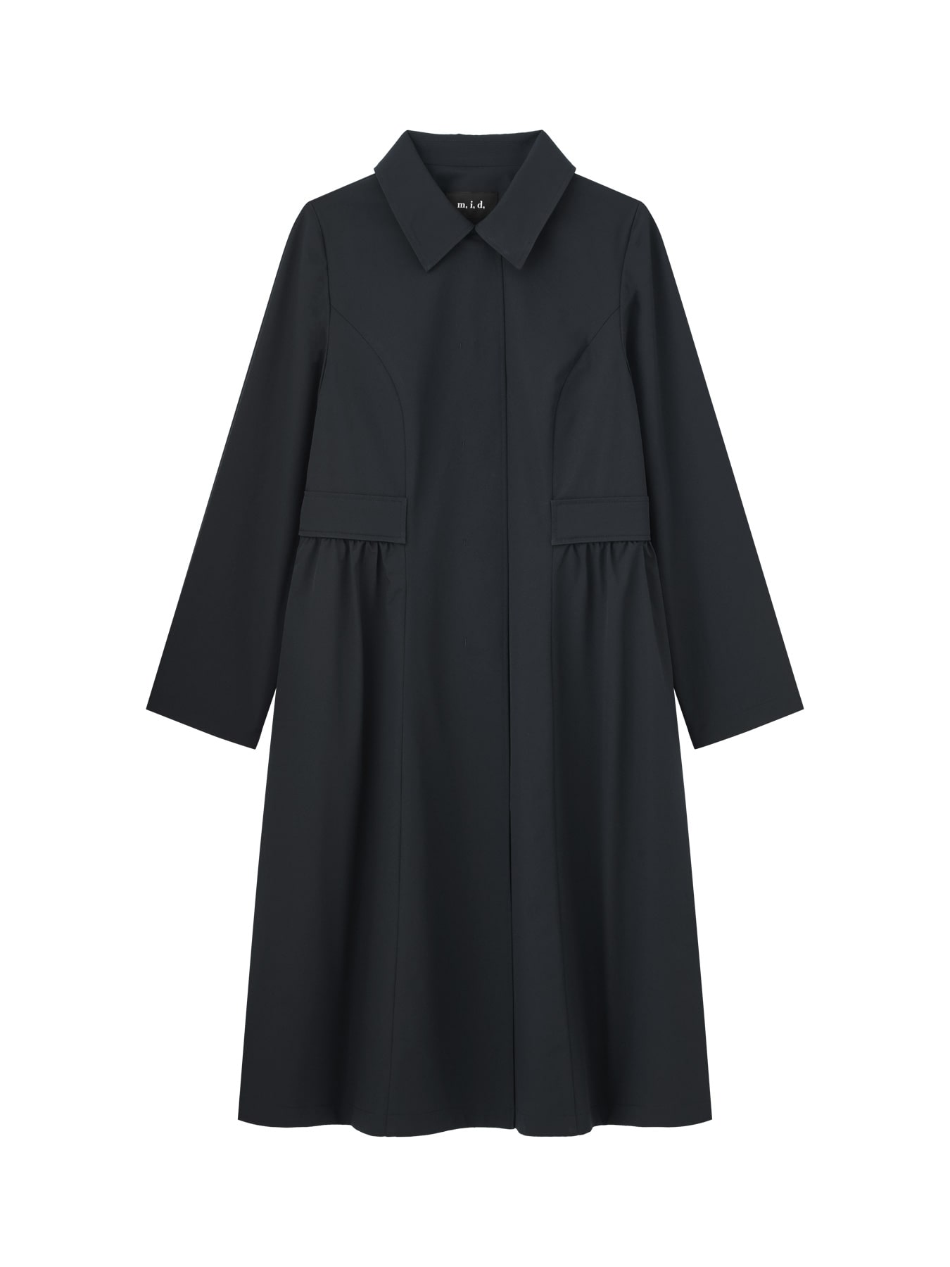 すっきりとしたスナップボタン仕様に、脇のベルトデザインとさりげないギャザーが柔らかな女性らしさをプラス。