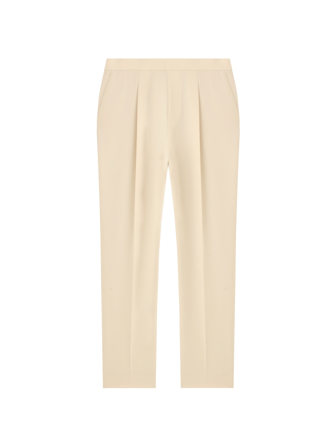 フロントウエストにはタックを施し、腰まわりにゆとりを持たせながらも、裾に向かってすっきりと細くなるシルエットに仕上げました。