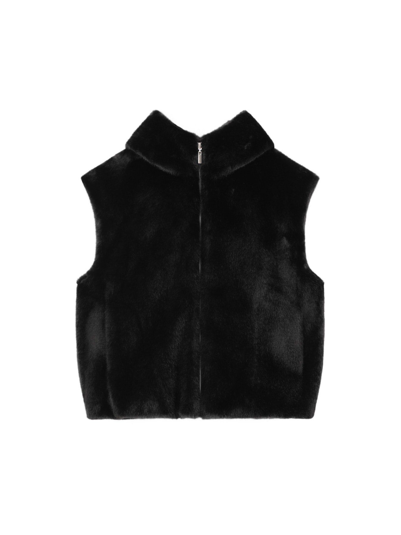 ミンクのようになめらかで上品な光沢を放つフェイクファー素材を使用した、大人のためのエレガントなフード付きベスト。ふっくらとした素材感ながら軽やかな着心地で、纏うだけでシーズンムードを高めてくれます。