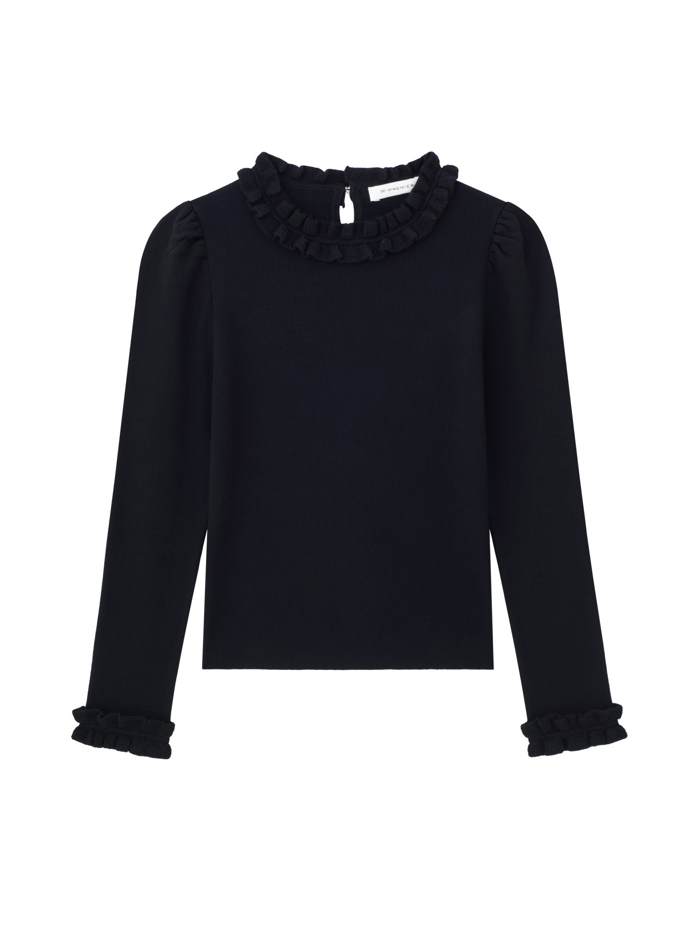 首元と袖口のフリルが華やかさを添える、エレガントなリブニットプルオーバー