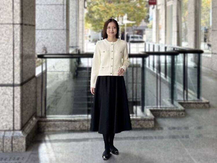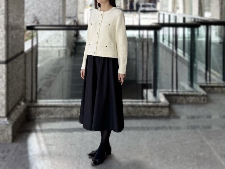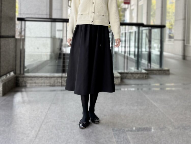 合わせた“ウエストゴムギャザーフレアスカート”は、上品な落ち感とほどよいハリが織りなす、気品あるフレアラインが魅力。