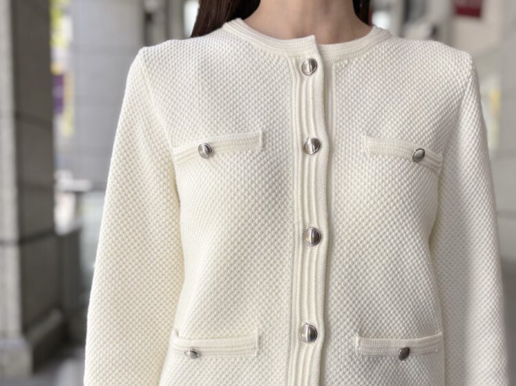 端正な佇まいの“メタルボタンニットジャケット”は、凹凸のある編地が生む豊かな表情が魅力。