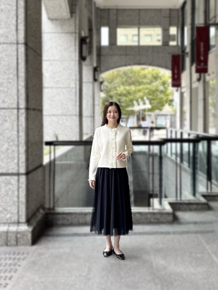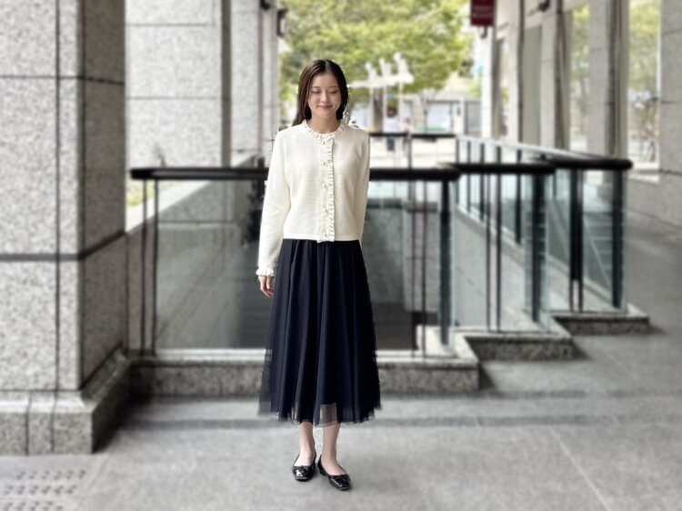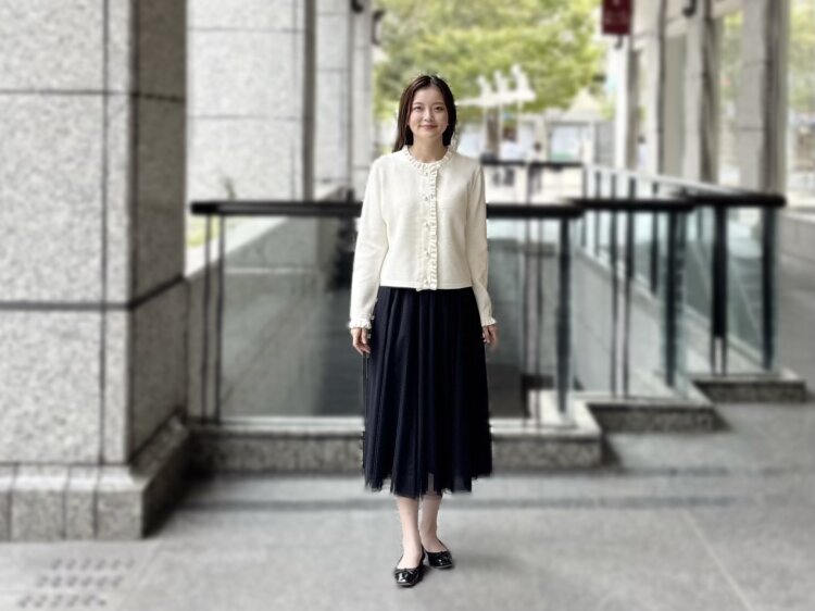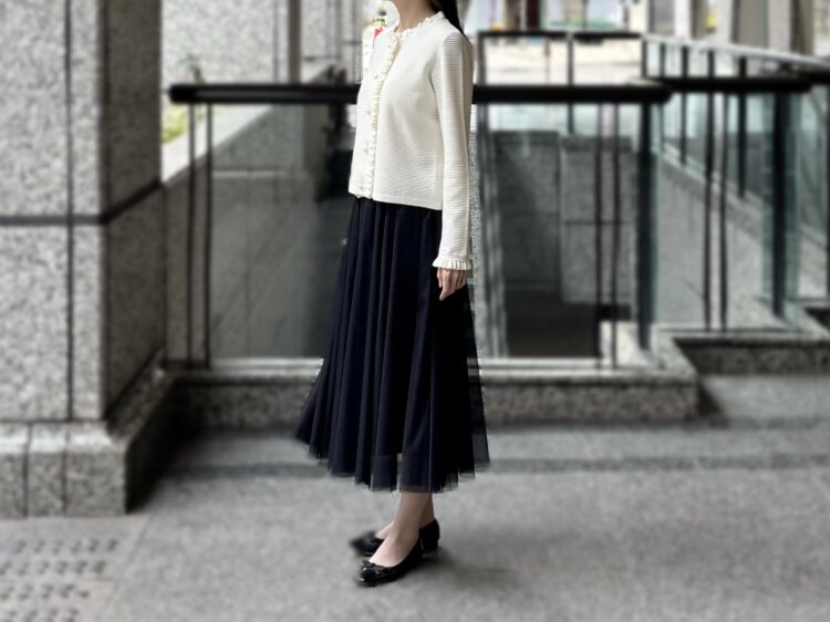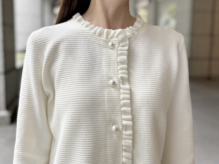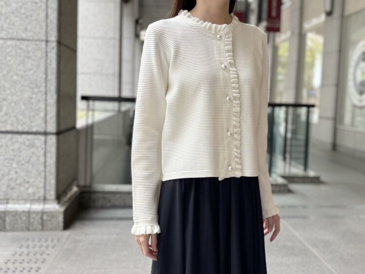 本日は、そんなパールボタンフリルニットジャケットの上品コーディネートをご紹介いたします。