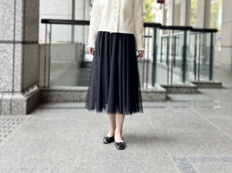 足元にはブラックのフラットシューズを合わせて抜け感をプラスしました。