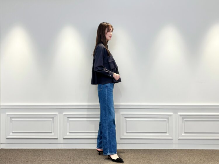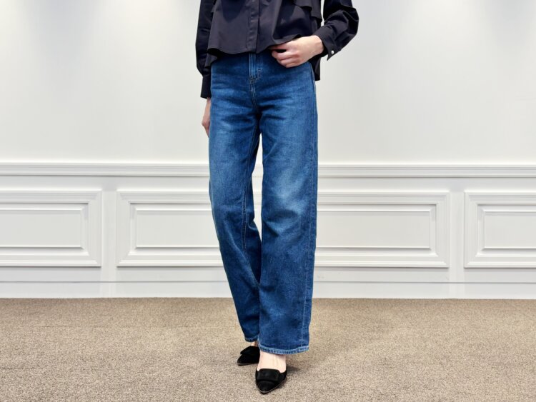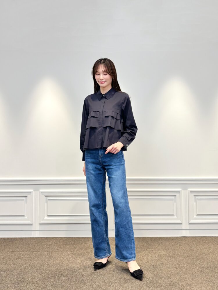 ボトムには、ストレートシルエットのデニムを合わせて、リラックス感と今っぽさをプラス。カジュアルになりがちなデニムも、綺麗めブラウスと組み合わせることで、ぐっと大人らしい印象にまとまります。足元はブラックのフラットシューズで引き締め、全体を上品にバランスよくまとめます。