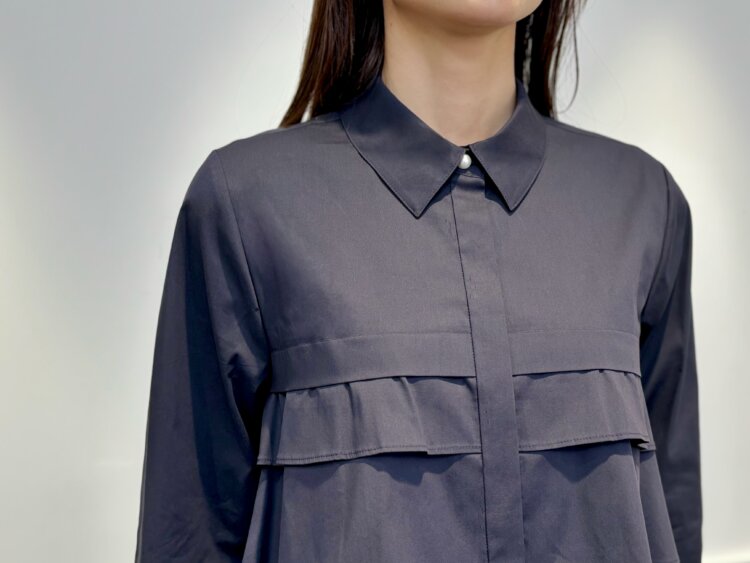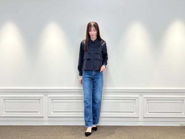 トップスは、襟付きデザインがきちんと感を演出するブラウス。フロントにあしらわれたティアードデザインが、程よく女性らしさを添えつつ、甘くなりすぎない洗練された印象に仕上げています。ネイビーカラーならではの落ち着きが、大人の品格を自然に引き立ててくれるのも魅力です。