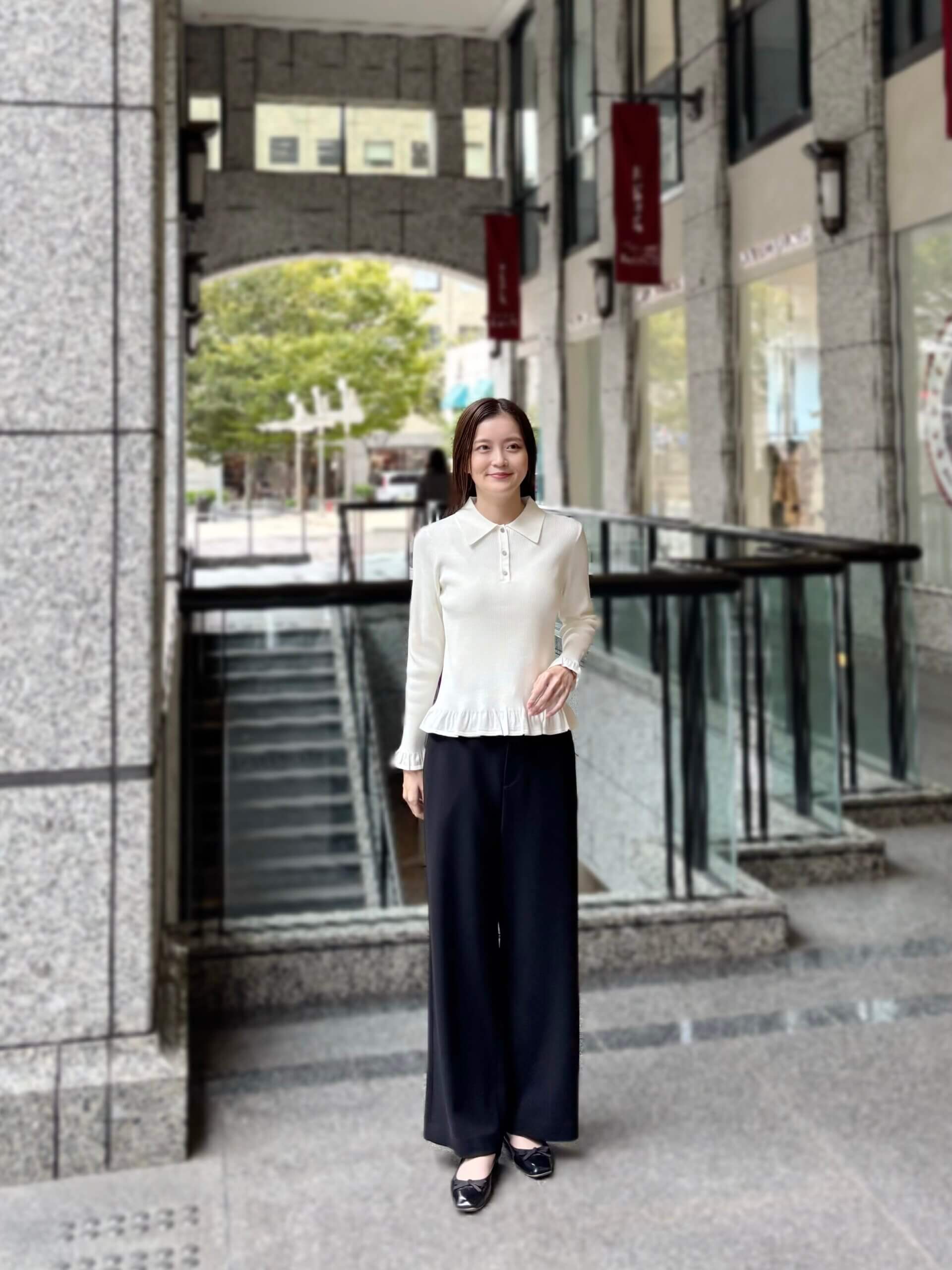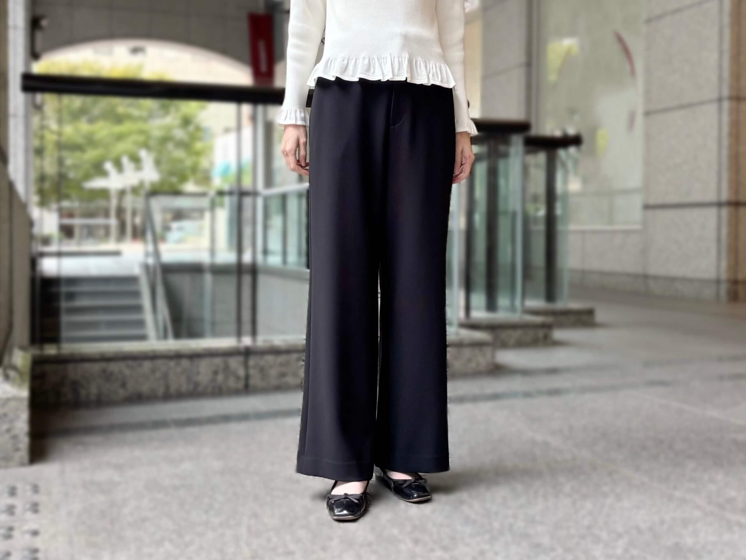 トップスの柔らかなフリルと、パンツのクリーンなライン。