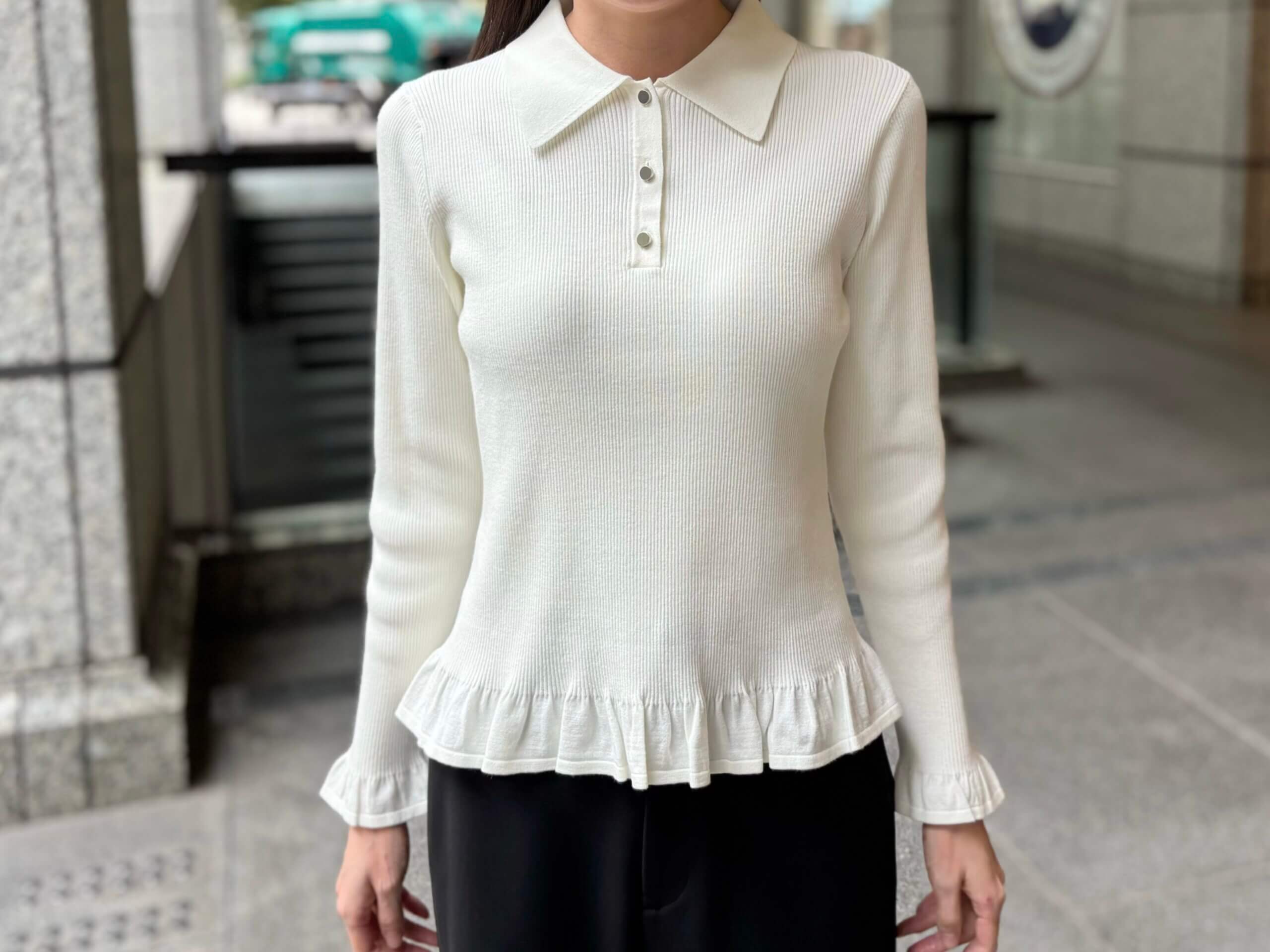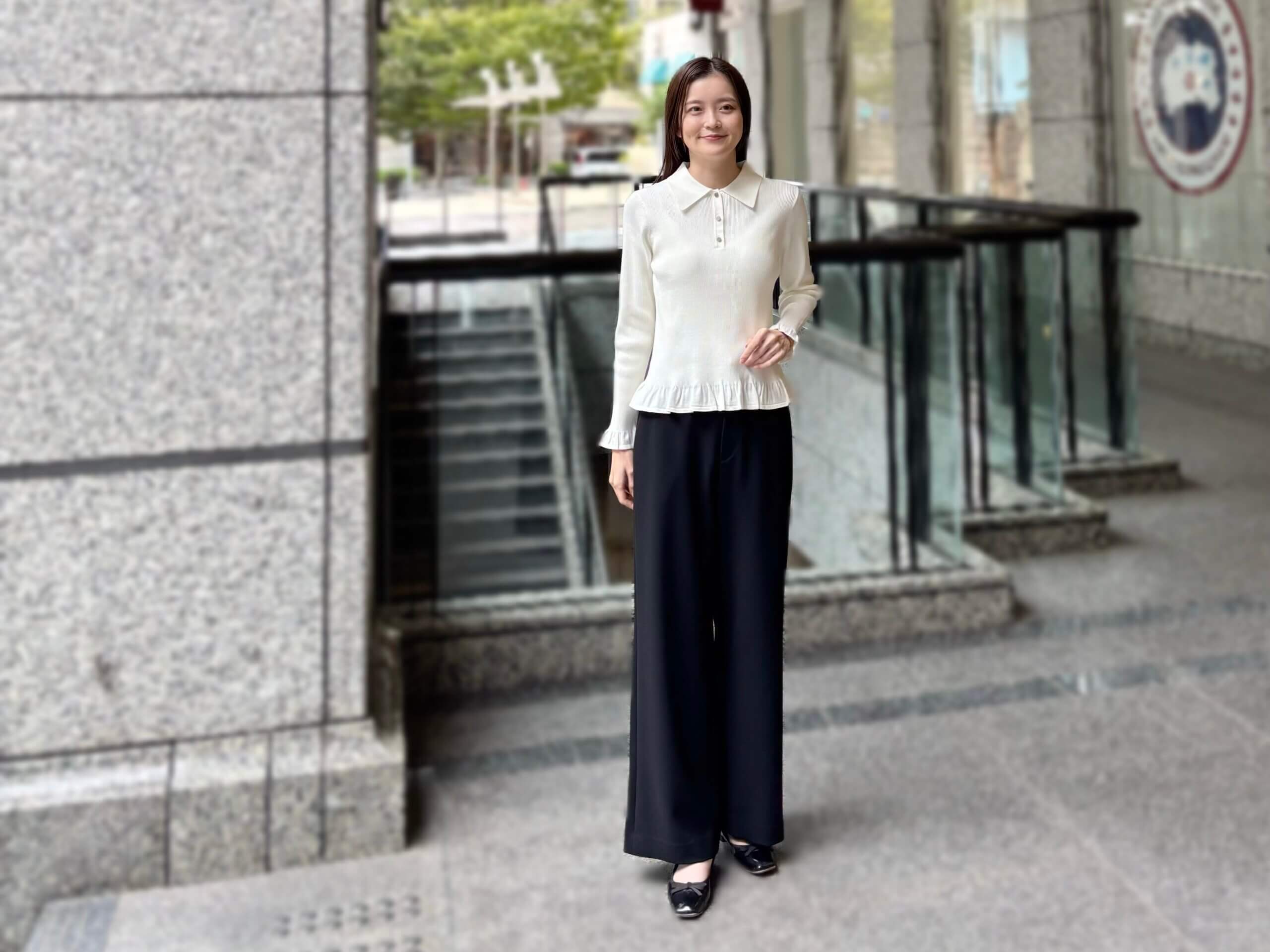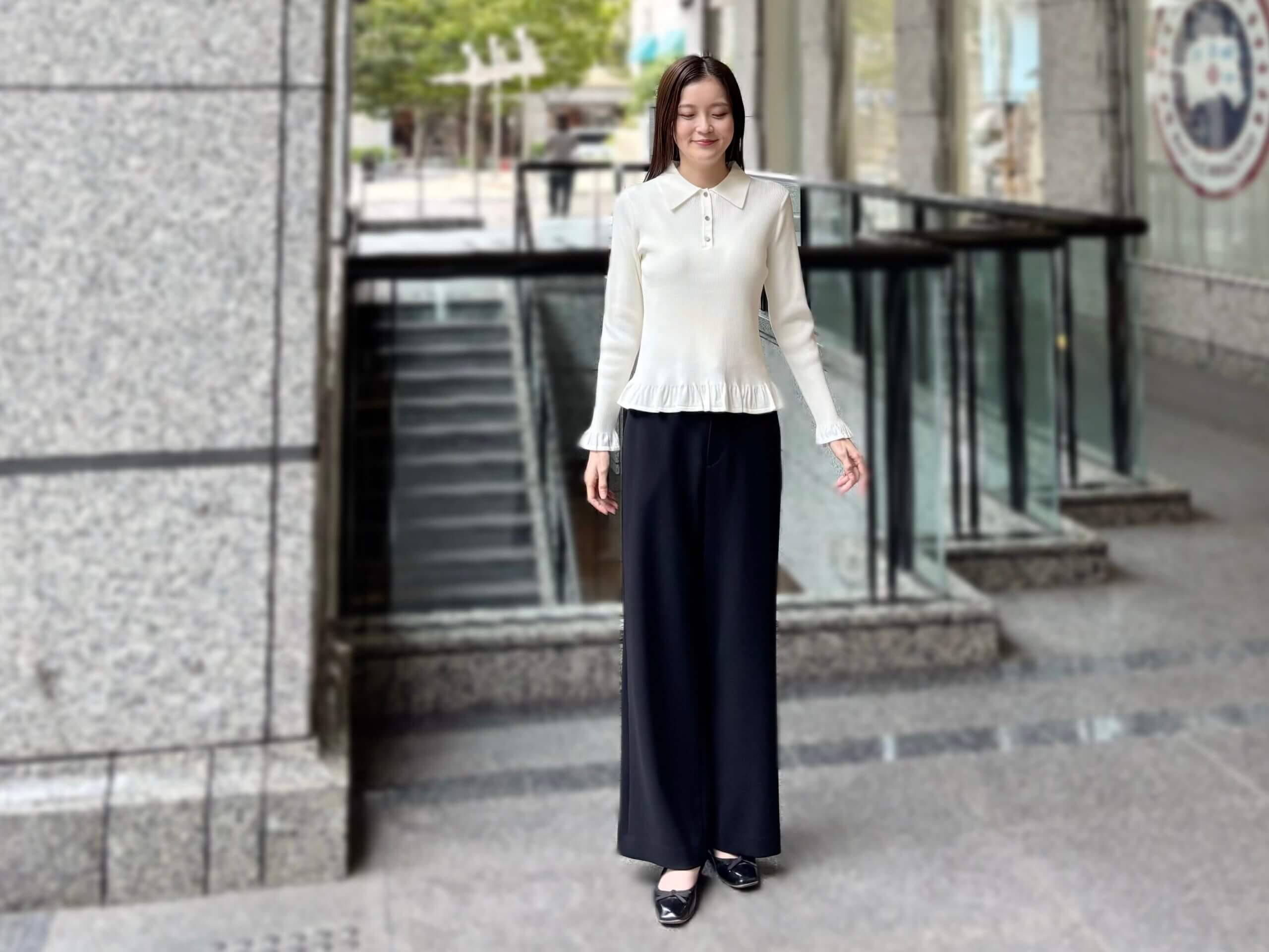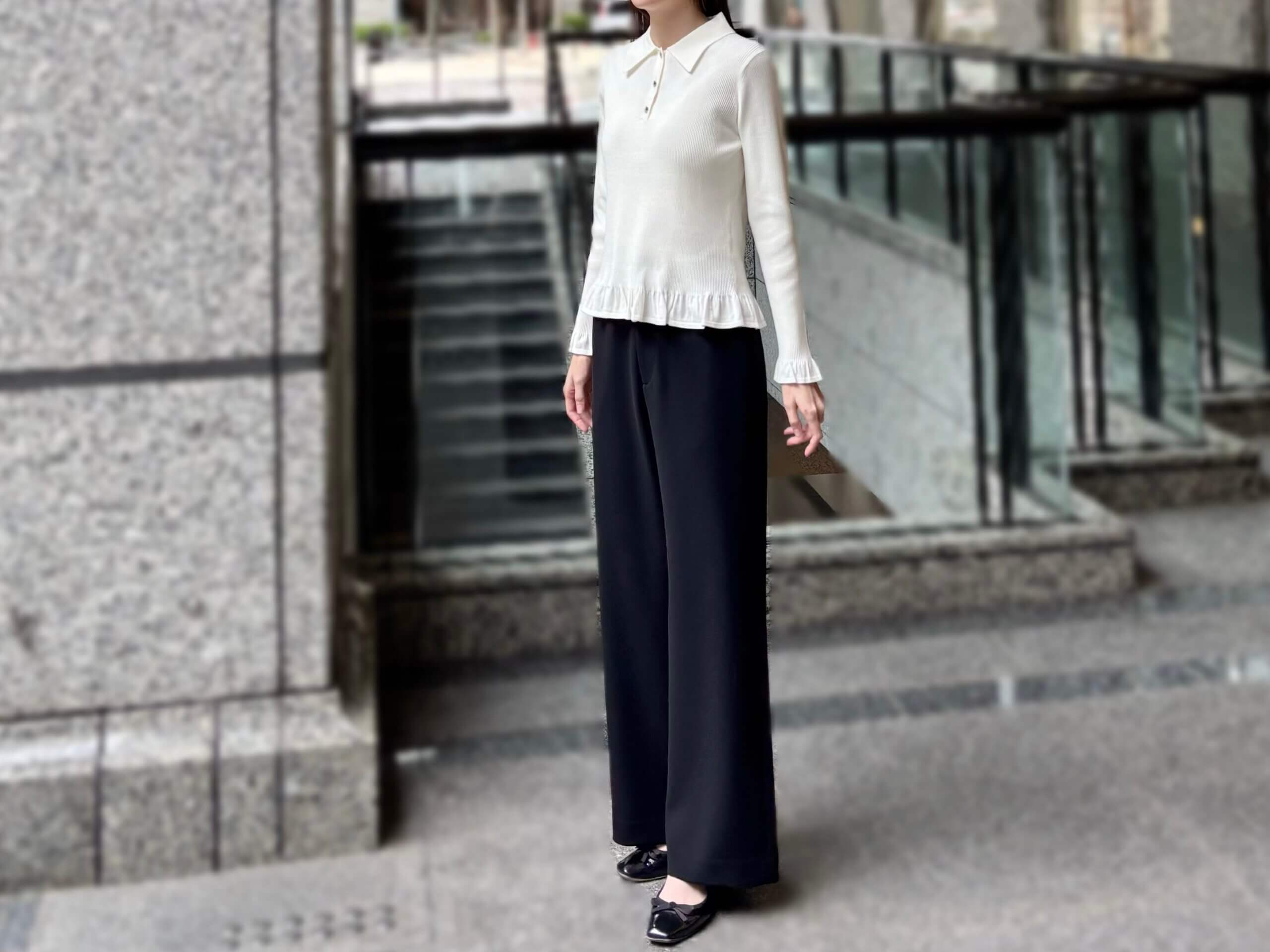 今日は、オンの日にぴったりなフリルポロニットプルオーバーを使ったきれいめスタイルをご紹介いたします。