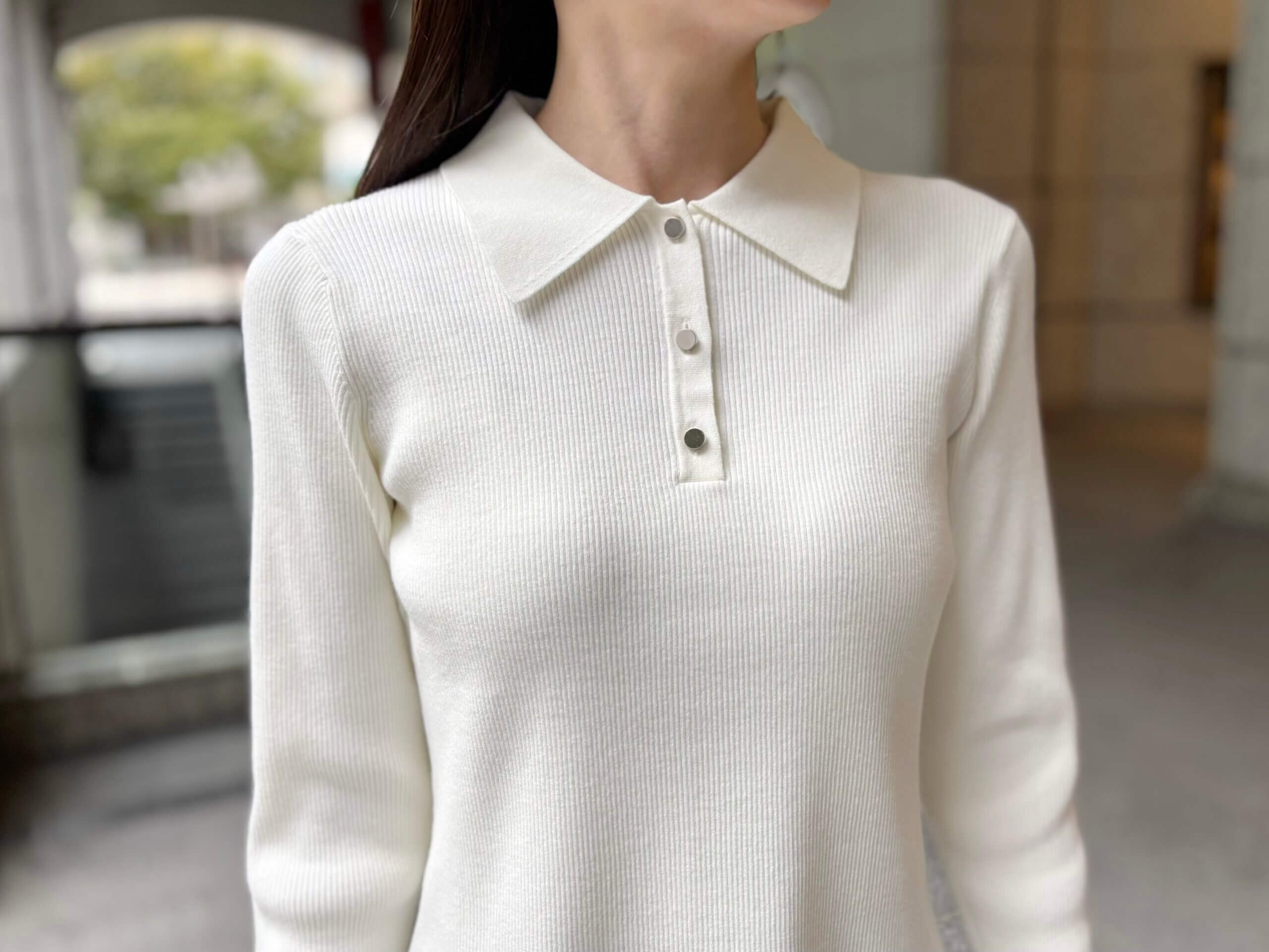 襟付きのデザインはきちんと感があり、ジャケットのインナーとしても映える万能さ。