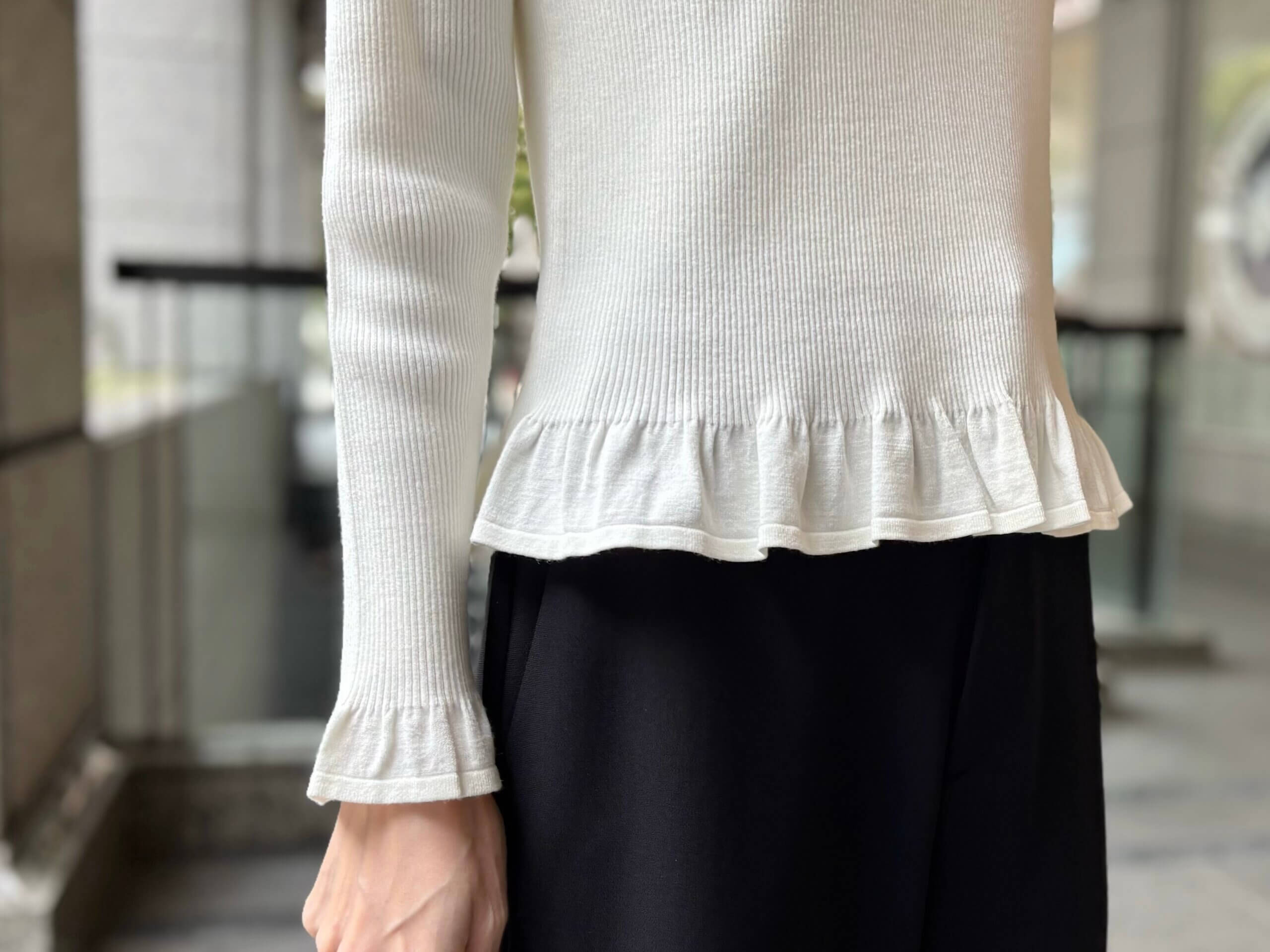 一見ベーシックながらも、裾と袖口にあしらわれた繊細なフリルが動くたびにふわりと揺れて上品な華やぎを添えてくれます。