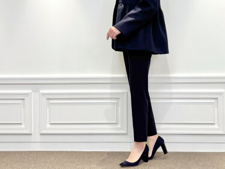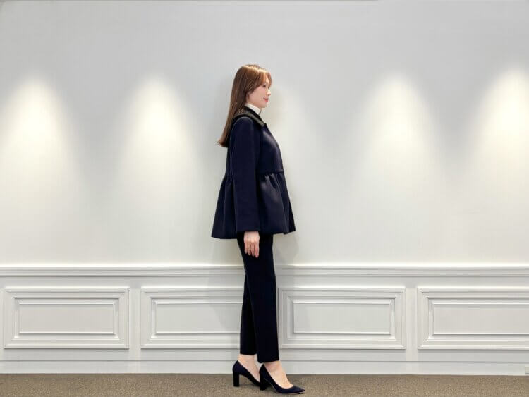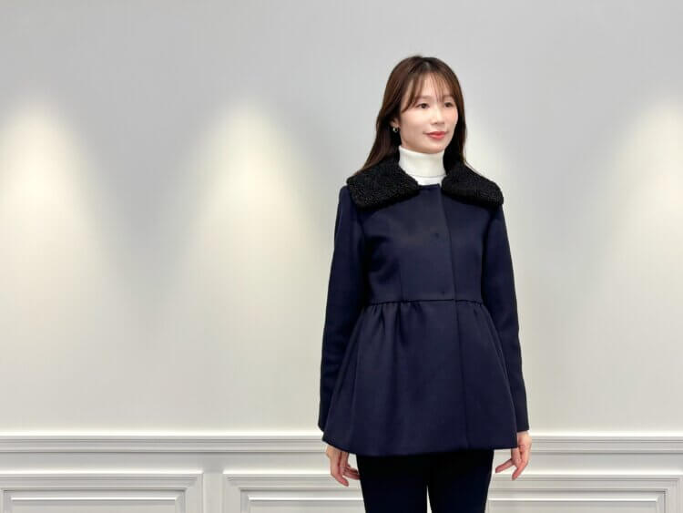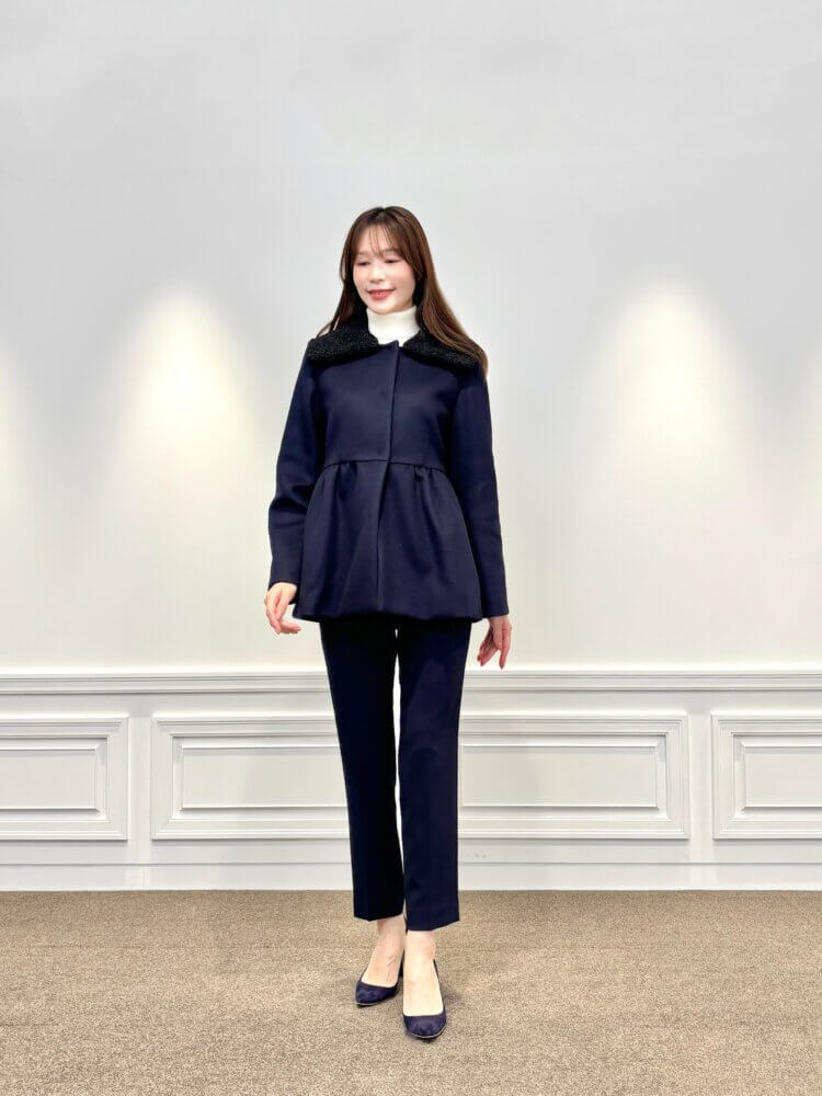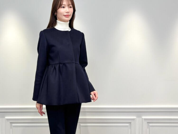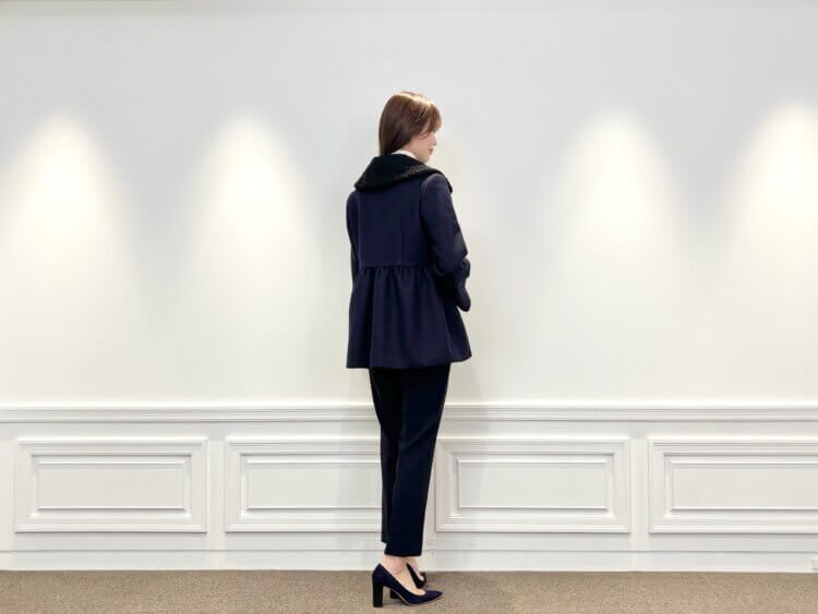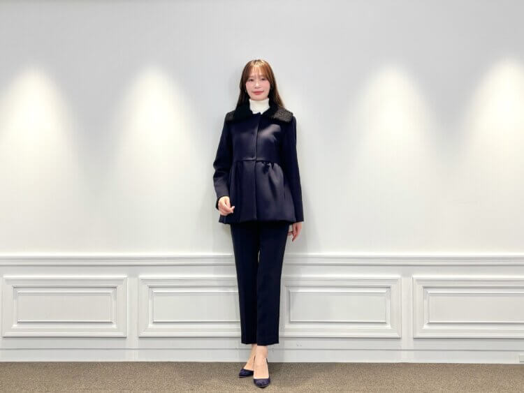 コートはウエストから広がるペプラムシルエットなので、体のラインをきれいに見せつつ「大人可愛い」を自然に演出。パンツも同じネイビーでまとめることで、落ち着きと上品さがあり、学校行事やお仕事シーンにもおすすめです。