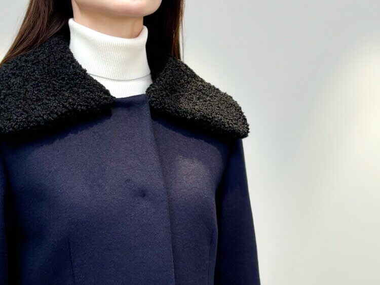 主役は、襟元のボアが印象的なネイビーのコート。ふんわりとしたボアカラーが顔まわりをやさしく包み込み、シンプルながらも季節感と華やかさをプラスしてくれます。さっと羽織るだけでコーデ全体がぐっと洗練された印象に。