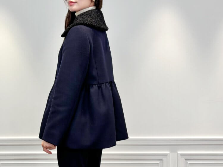 ウール100%のショートビーバー素材を贅沢に使用した<ボアカラーペプラムコート>は、上質な素材感が端正で知的な雰囲気に魅せてくれる一着。着ぶくれしがちな冬の装いにウエスト切り替えのペプラムシルエットが、メリハリある美シルエットへと導いてくれます。