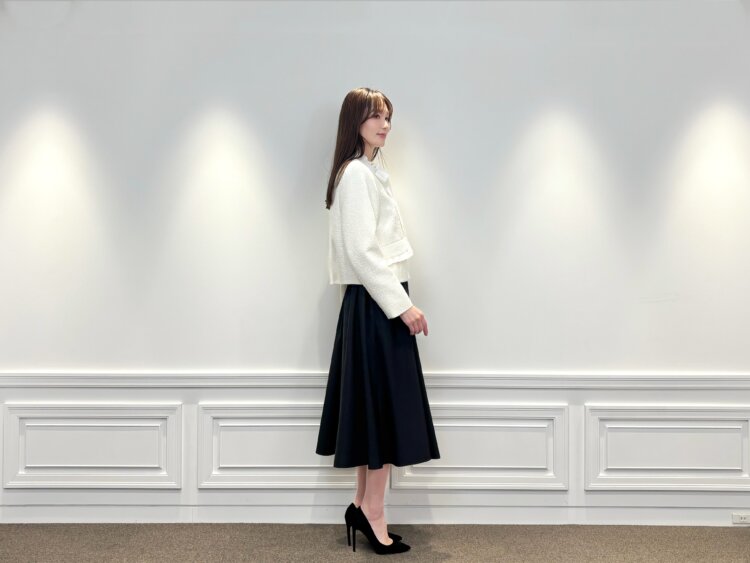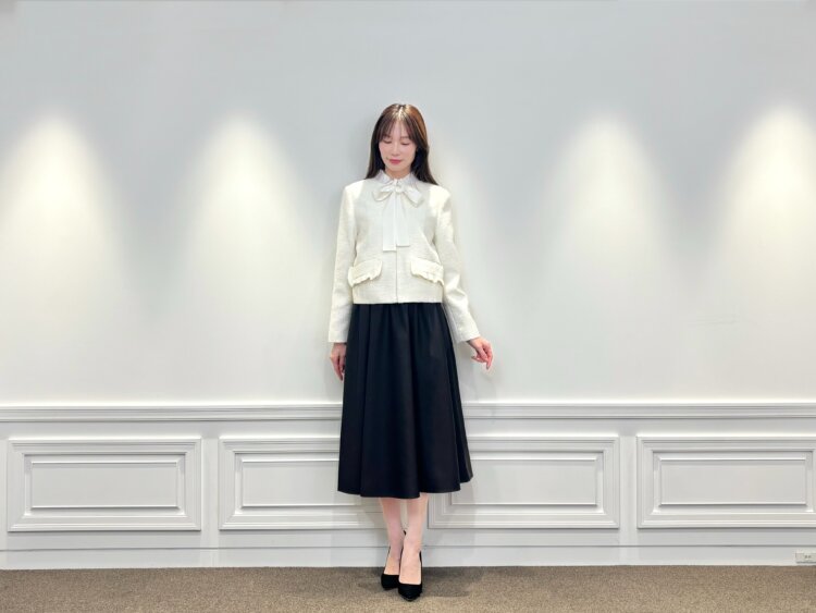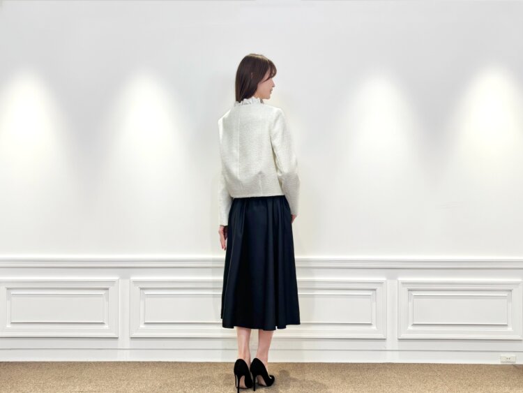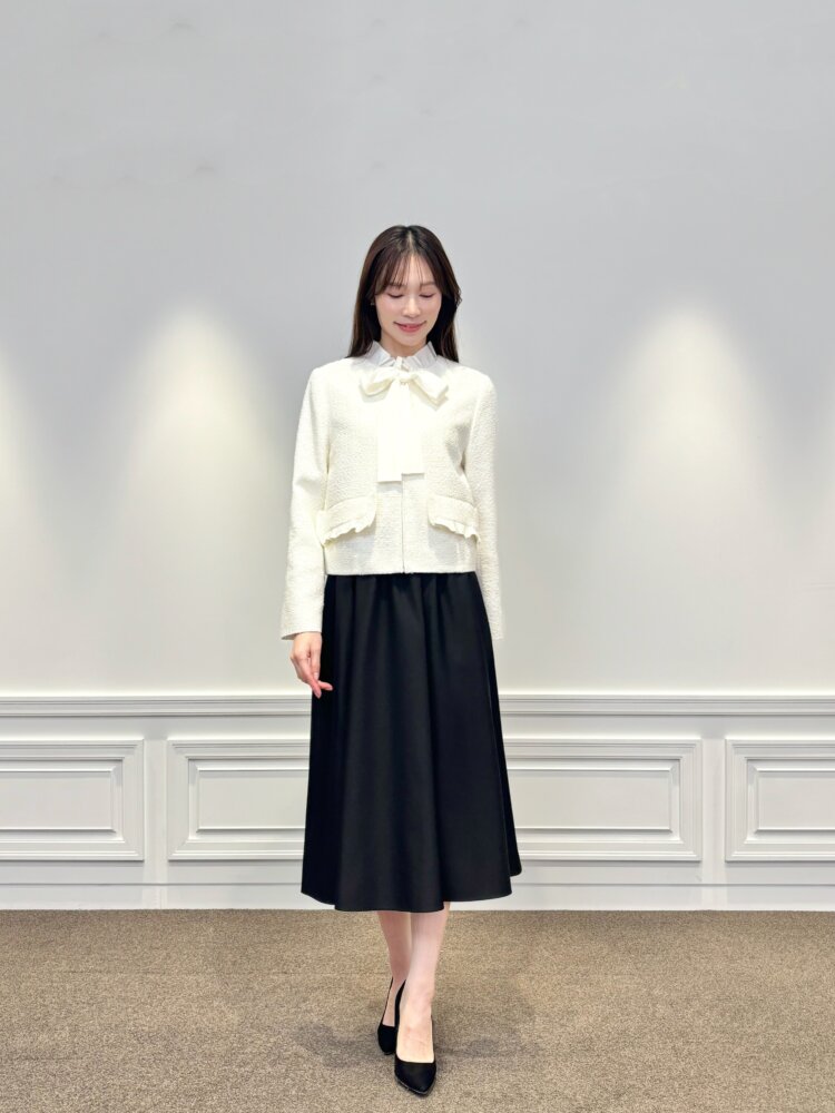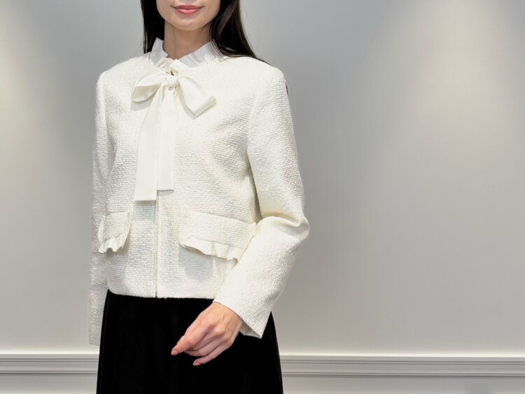 ジップアップ仕様のツイードジャケットは、きちんと感がありながらも堅くなりすぎず、羽織るだけで華やかな印象に。インナーにはフリルネックボウタイリボンブラウスを合わせ、顔まわりをやさしくフェミニンに仕上げました。リボンデザインが写真映えし、セレモニーシーンにもぴったりです。