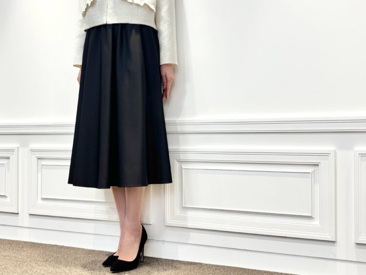 上品な光沢とほどよいハリ感でエレガントな佇まいへと導いてくれる<ウエストゴムギャザーフレアスカート>。