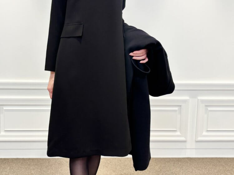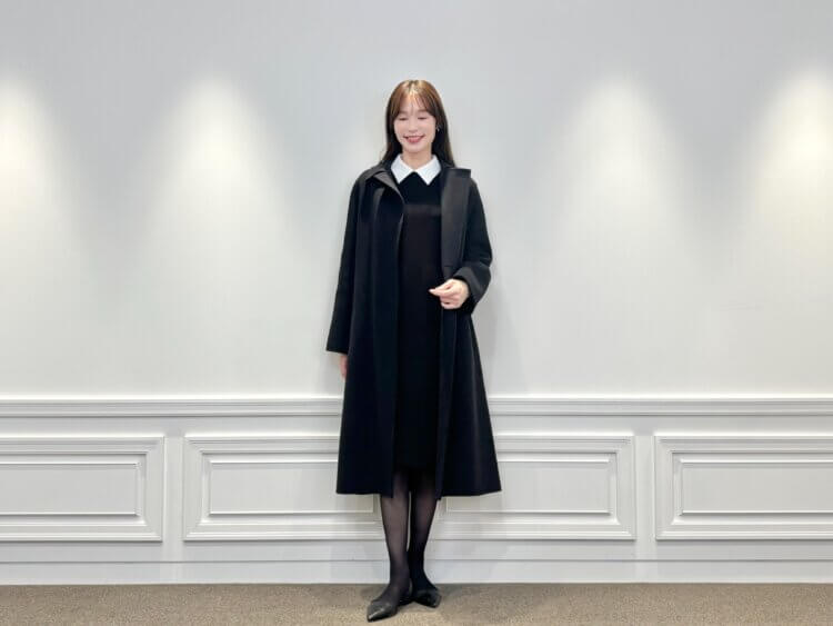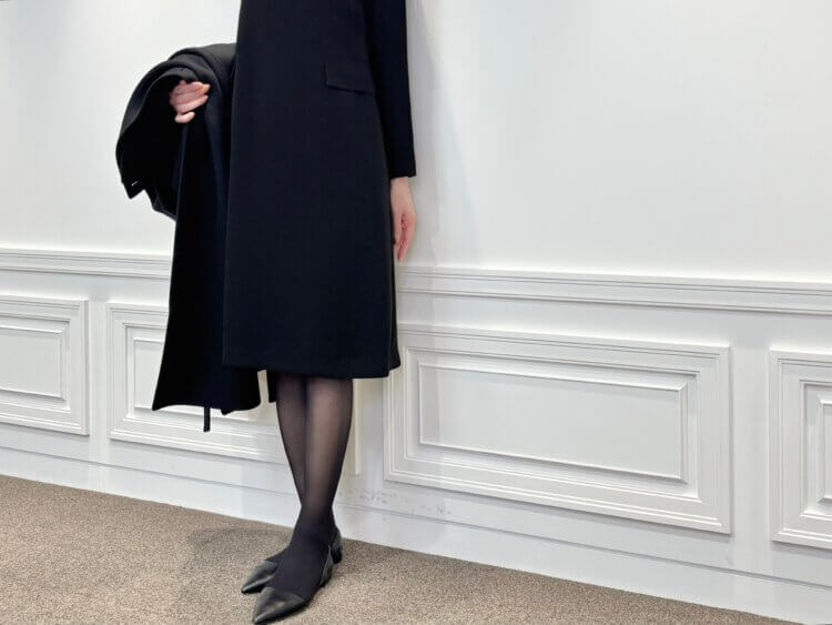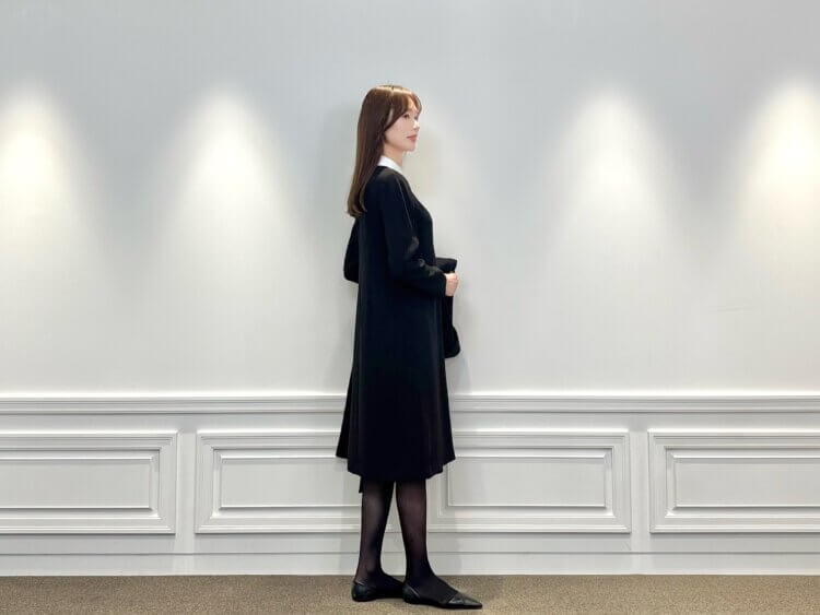 アウターは同色のブラックコートをあわせ、全体を落ち着いたトーンで統一。モノトーンならではの“知的さ”と“清潔感”が際立ちます。足元はフラットシューズで抜け感をプラスすることで、大人の洗練された洒落感が叶います。