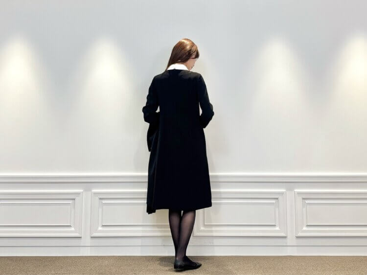 白襟が凛と映えるブラックワンピースは、シンプルさの中に“きちんと感”が宿る一枚。首元の白が顔まわりを明るく見せてくれます。程よくゆとりのあるシルエットで身体のラインを拾い過ぎない軽やかな着心地。上品なミディ丈で、学校行事やお仕事シーンなど、信頼感を求められる時にもぴったりです。
