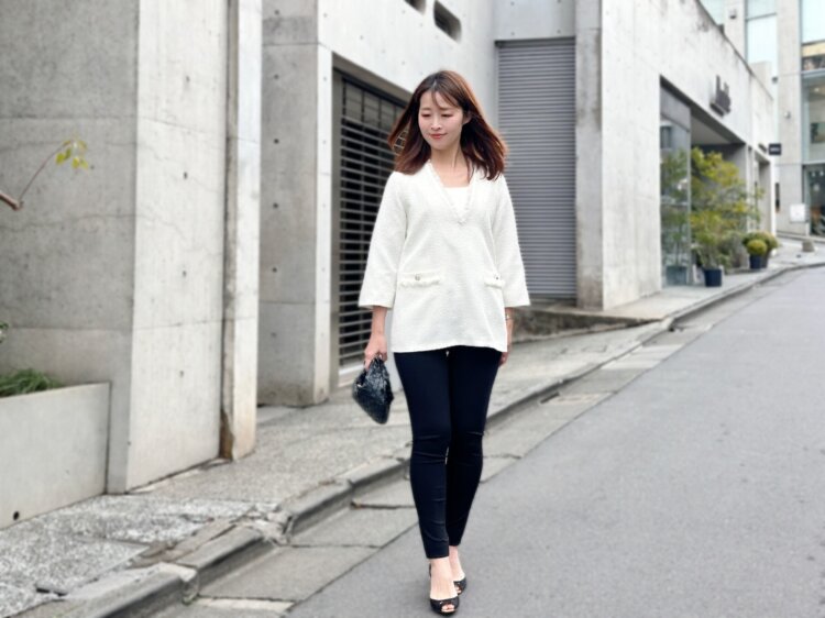 今回はキャミソールをインナーに合わせて、軽やかで女性らしい印象に。ボトムスにはストレッチの効いたパンツを合わせているので、長時間の外出やお仕事、送迎などアクティブな日にもストレスフリーに過ごせます。