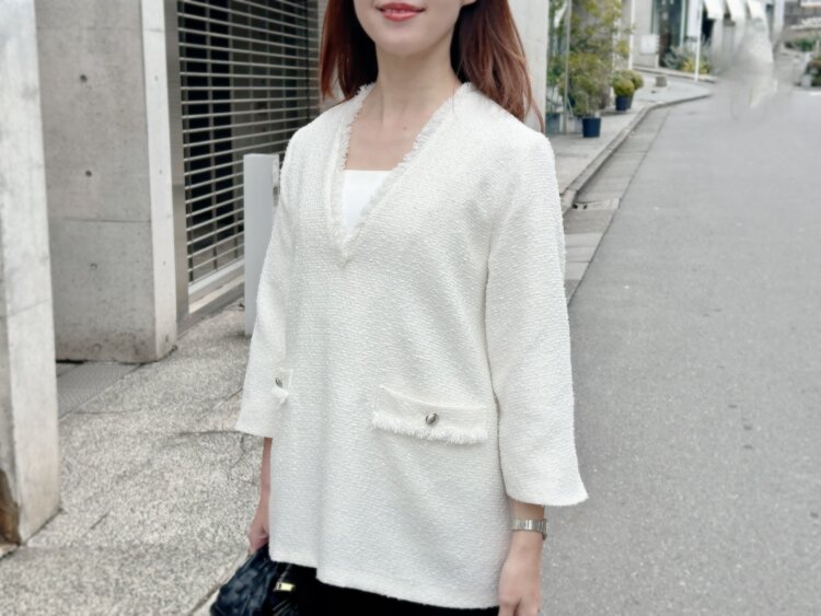 表情のあるツイード素材が、シンプルなコーデでも自然と華やかさをプラスしてくれるので、朝コーデに迷った日もこれを選べば安心。深めのVネックが顔まわりをすっきり見せてくれて、抜け感のあるバランスに整えてくれます。