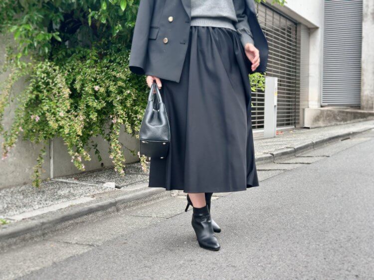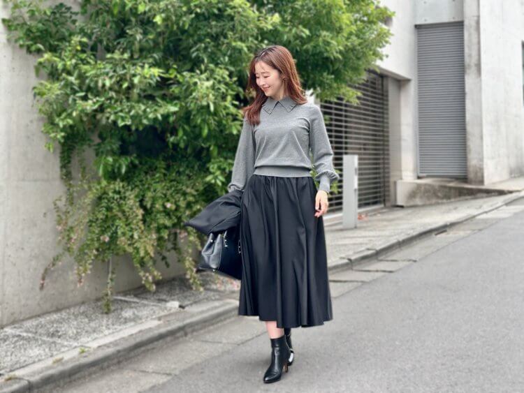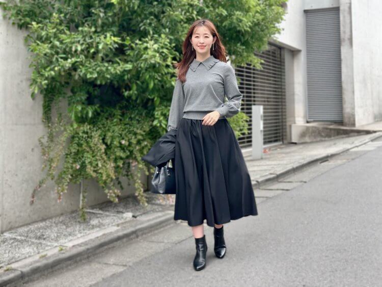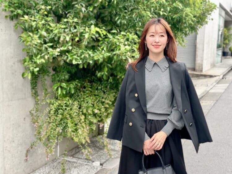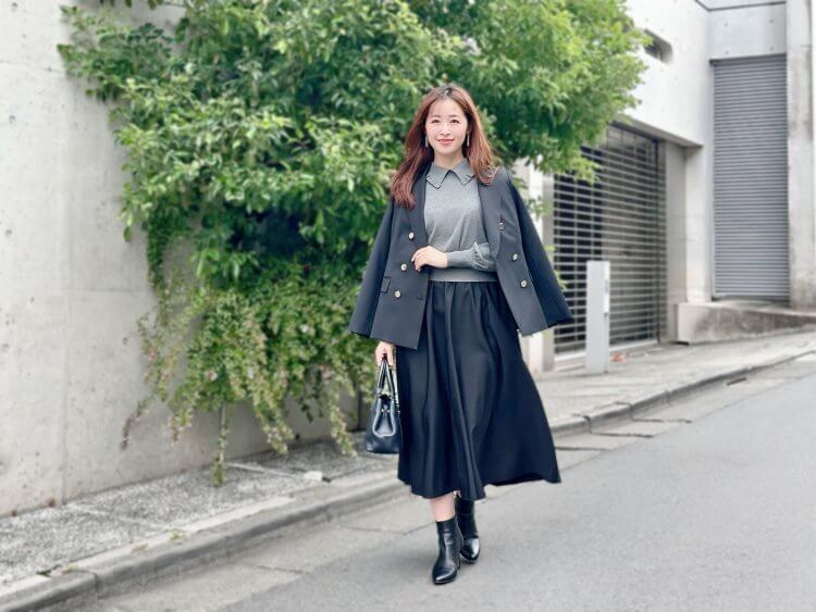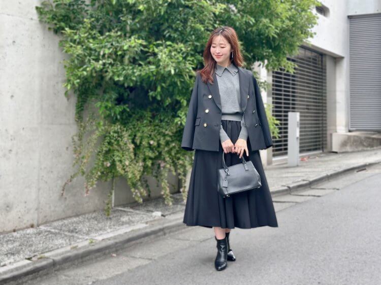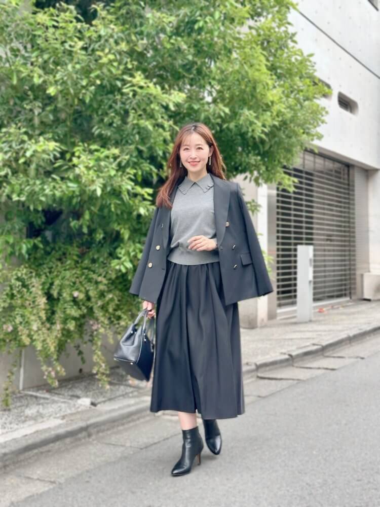 ブラック×グレーの落ち着いたトーンでまとめることで、通勤にも、学校行事やきれいめなお出かけシーンにもマッチする“大人の万能モノトーンスタイル”に仕上がりました。