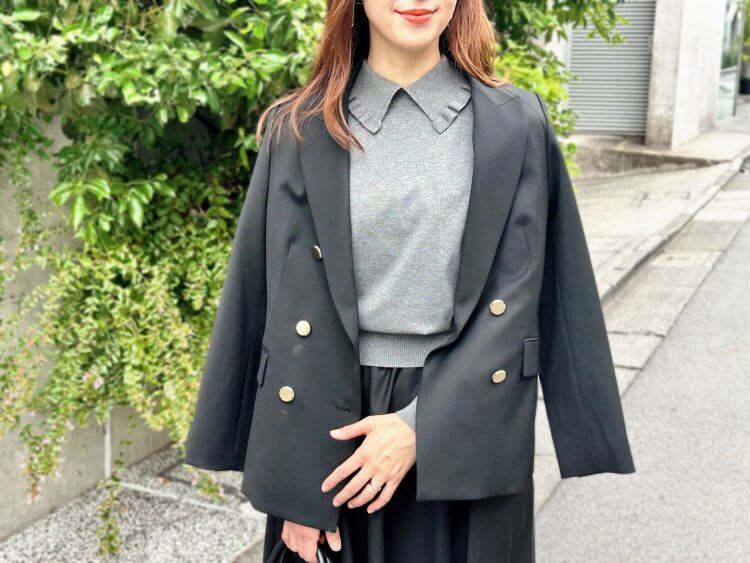 羽織ったのは、メタルボタンピークドラペルダブルジャケット。ゴールドボタンが上品なアクセントになり、きちんと見えする一着です。肩に軽くかけてもサマになるので、オフィスでもお出かけ先でも頼れる万能アイテム。