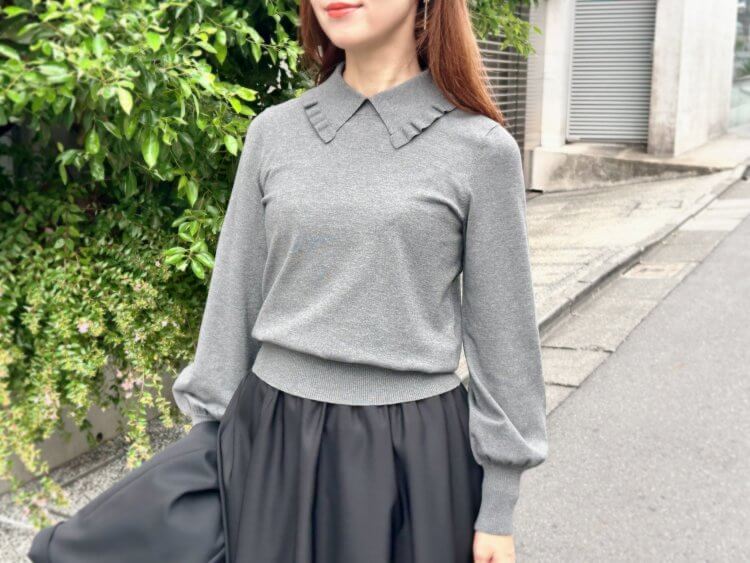 襟元のフリルが印象的なフリルカラーニットプルオーバーは、シンプルながら一枚で華やかに見せてくれる優秀トップス。