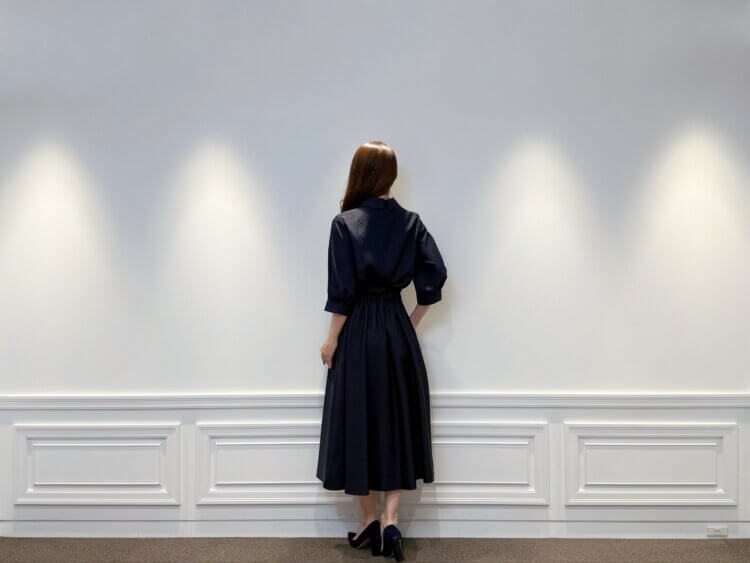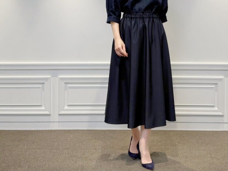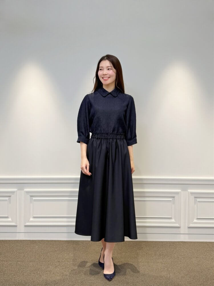 深みのあるネイビーを全身にまといながら、素材感やシルエットの違いで奥行きを出したスタイリング。甘さを抑えた配色だからこそ、デザイン性のあるトップスやフレアスカートの美しさが引き立ちます。足元にはネイビーのパンプスを合わせ、統一感のある洗練された印象に。30〜40代の女性にふさわしい、品格と柔らかさを併せ持つ大人の装いです。