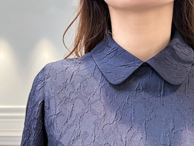 <ジャガードデザインスリーブブラウス>は、立体感のあるジャガード素材と、印象的なスリーブデザインが特徴の一枚です。シンプルな身頃に対して袖に表情を持たせることで、オールネイビーでも単調にならず、さりげない華やぎを演出します。きちんと感がありながらも女性らしさを感じさせ、スカートにもパンツにも合わせやすい万能なブラウスです。