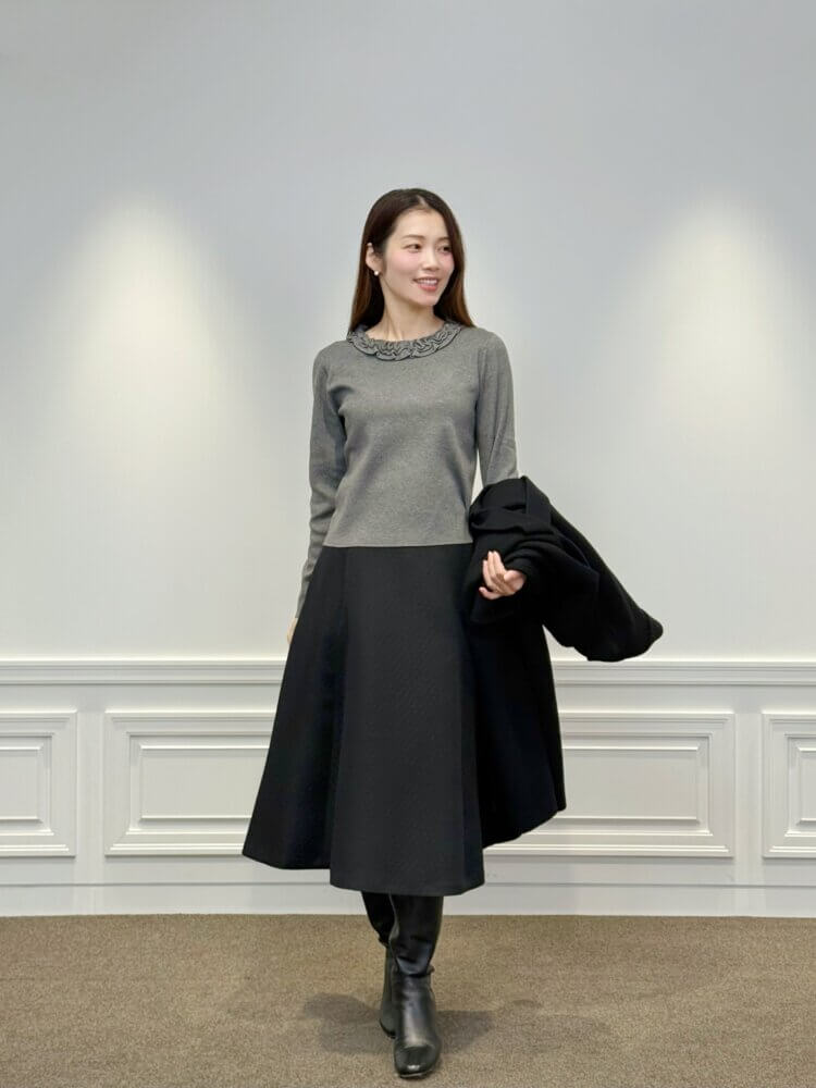 立体的な表情が美しいキルティングジャガードスカートを中心に、柔らかなグレーのフリルニットと、上質なウールのロングコートを合わせた冬のエレガントスタイル。モノトーンでありながらもコントラストが強すぎず、グレーがほんのり抜け感を添えることで、落ち着いた華やぎのある大人の装いに仕上がります。シルエットは縦のラインを丁寧に整え、上質感と女性らしさの両方を自然に感じさせるバランスです。