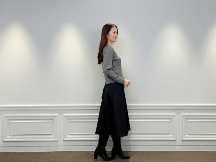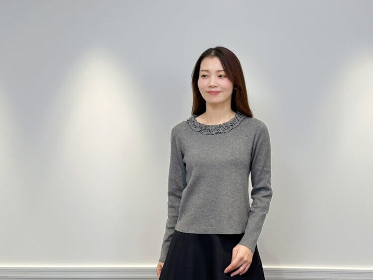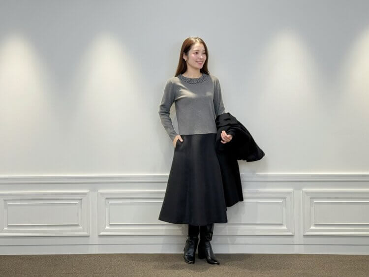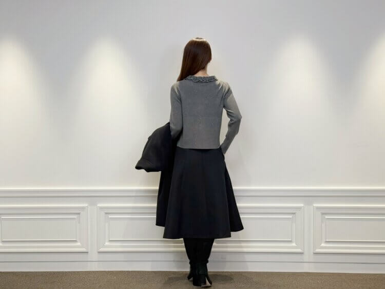 <フリルニットプルオーバー>は柔らかなグレーがコーデ全体のトーンを軽やかに整え、ブラックボトムにも自然になじむニュアンスカラーとして活躍します。繊細なフリルが顔まわりにさりげない華やかさをプラスし、アウターを羽織った際にも上品な女性らしさをキープします。